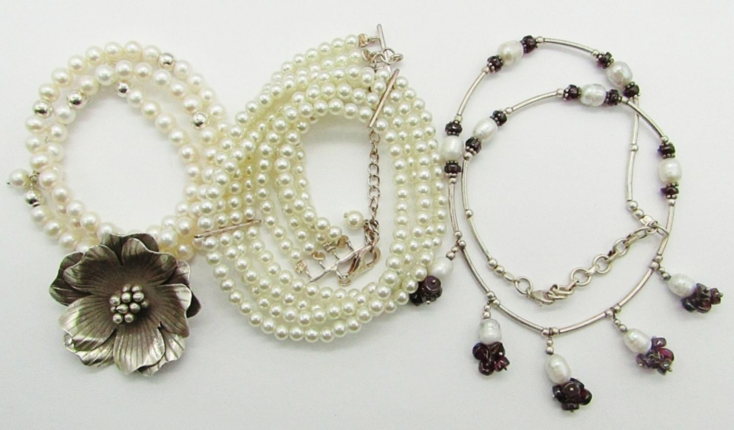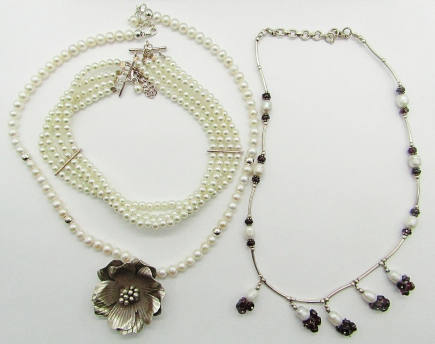 18″ Marked 925 Sterling, Pearl, Red Bead Cluster; 19″ Marked 925 Sterling, Pearl, and Flower Pendant; 11.5″ Marked 925 Sterling, Pearl Choker.