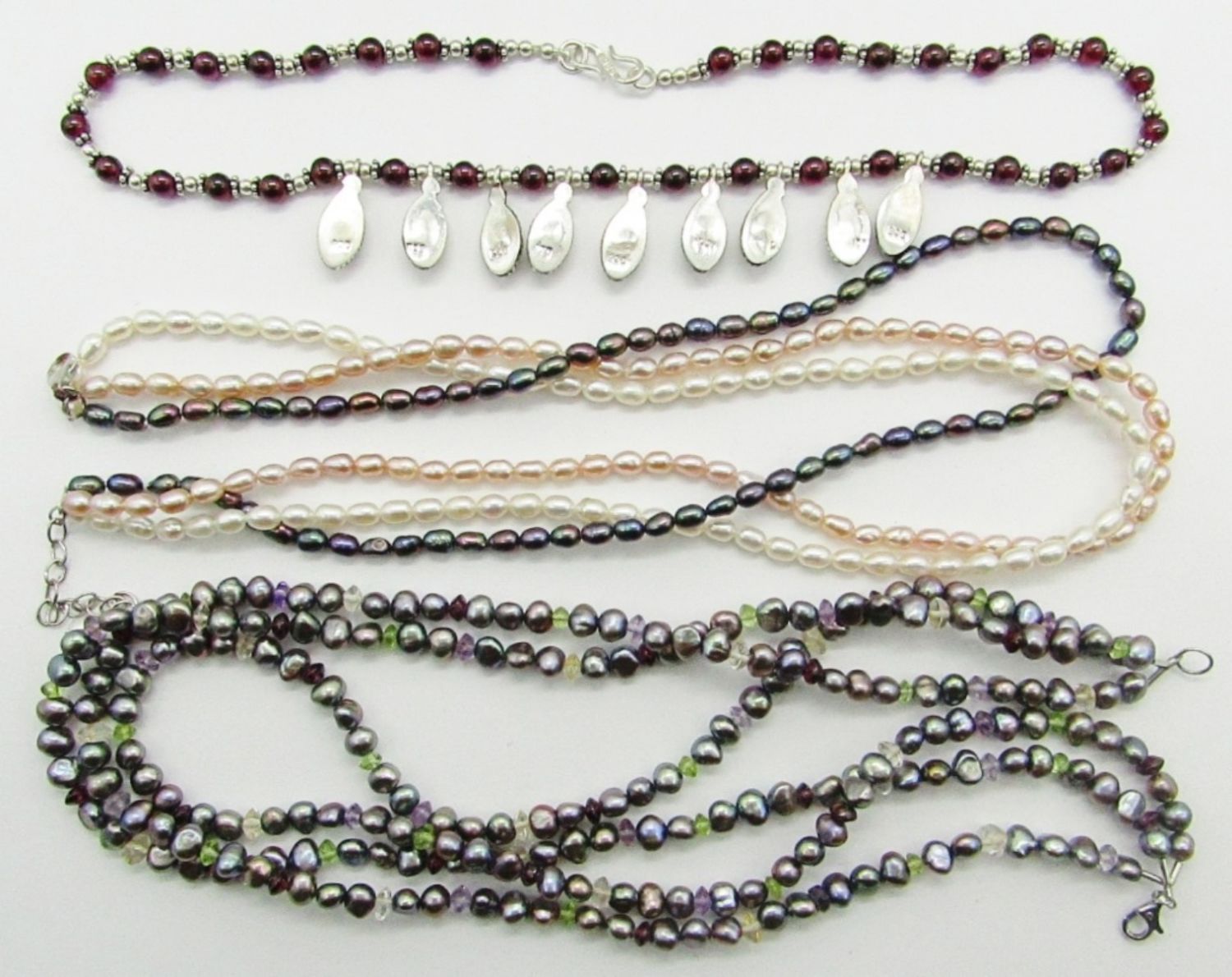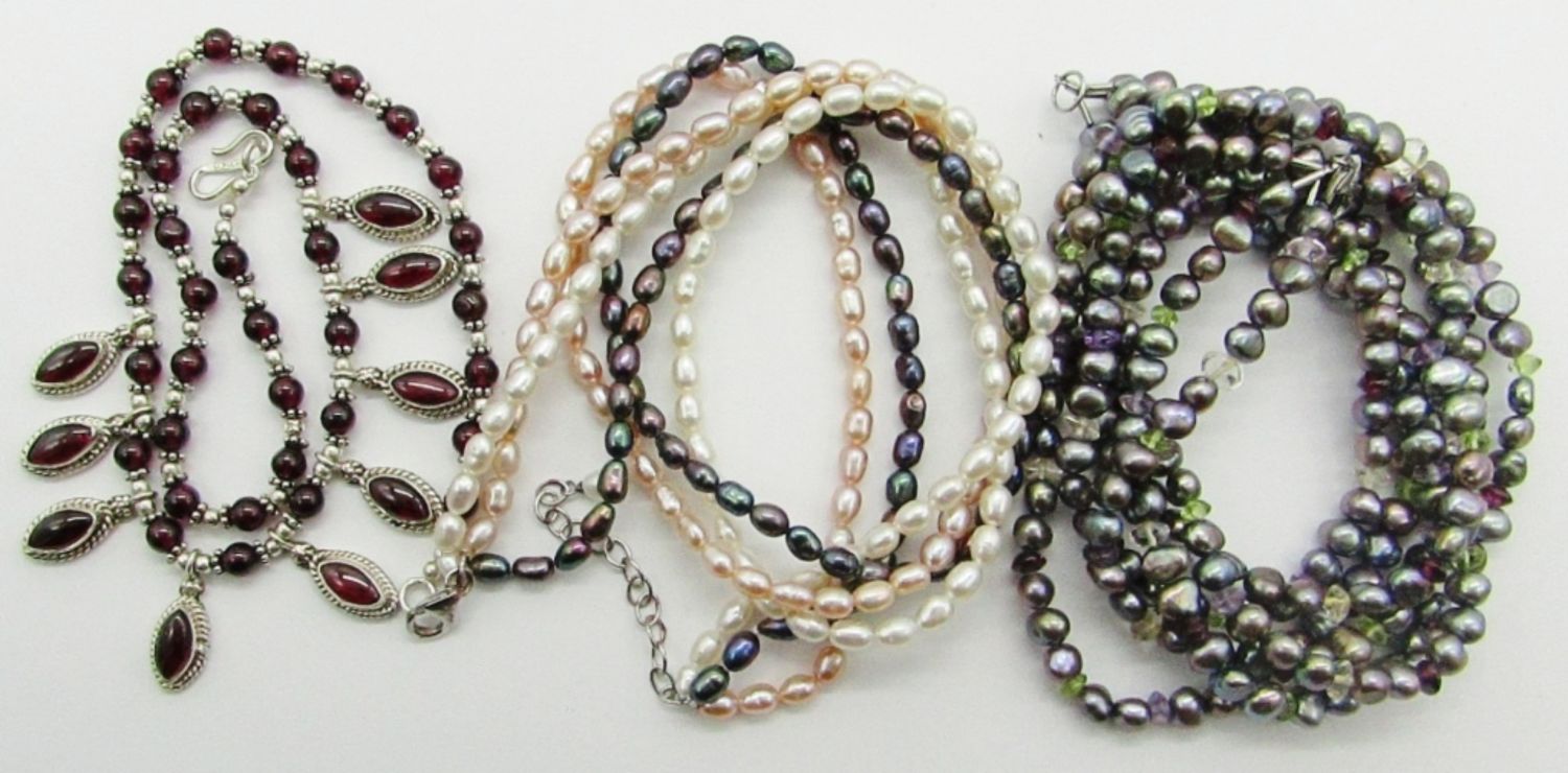 16″ Marked 925 Multi Strand Sterling, Pearl; 16″ Marked 925 Multi Strand Sterling, Pearl, Multi-Color Beads; 15.5″ Marked 925 Sterling, Garnet.