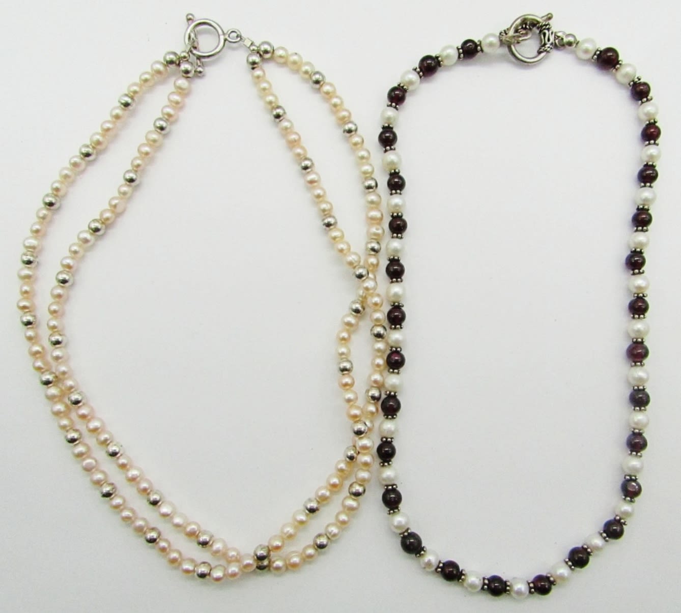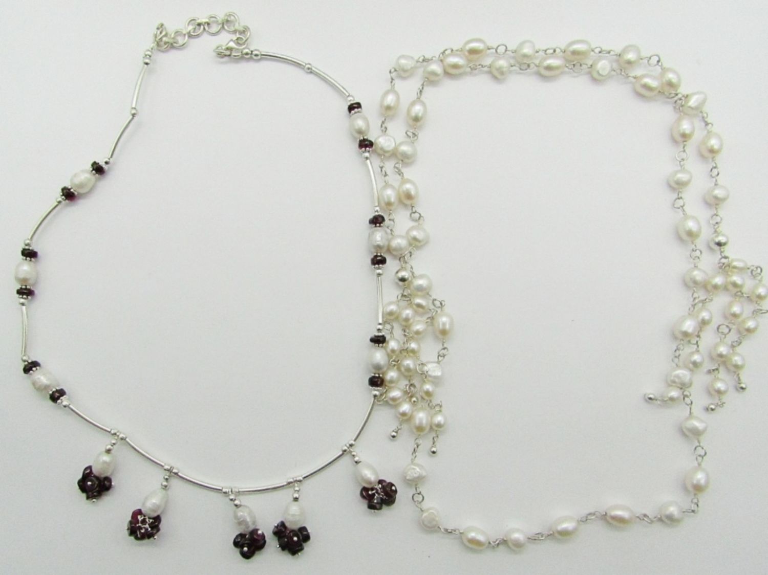 19″ Marked 925 Sterling, Pearl, Red Bead Cluster; 30″ Pearl Beaded Necklace/Scarf; 17″ Marked 925 Sterling, Pearl, Garnet Beads; 15″ Double Strand Marked 925 IW Sterling, Pearl.
