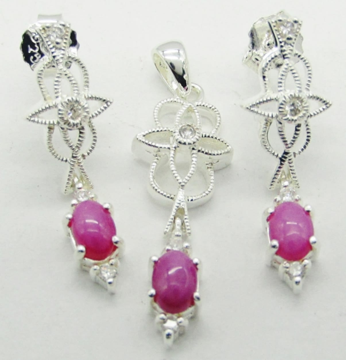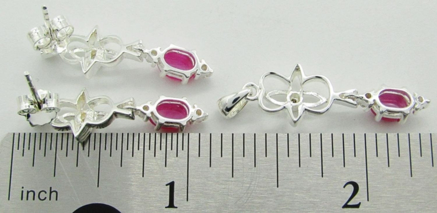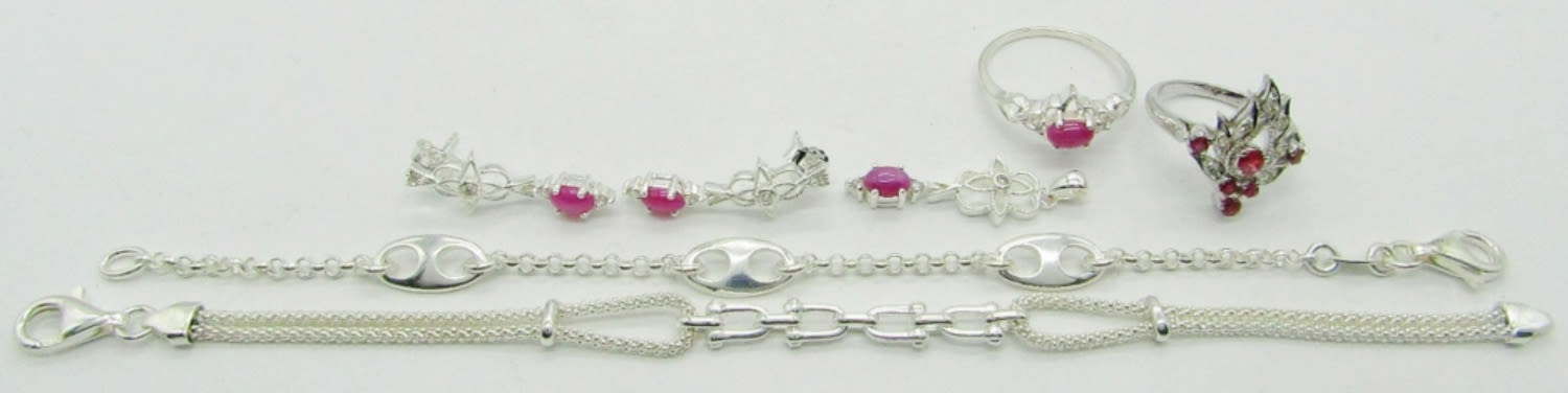 13.7DWT, 2 BRACELETS STAMPED ON THE LOBSTER CLASP 7IN LONG, 1 PAIR OF DANGLED PIERCED EARRINGS WITH RUBY STONES, 2 RUBY STERLING RINGS (SIZE 6,9), PENDANT IS 1 1/2IN LONG, ALL STAMPED 925