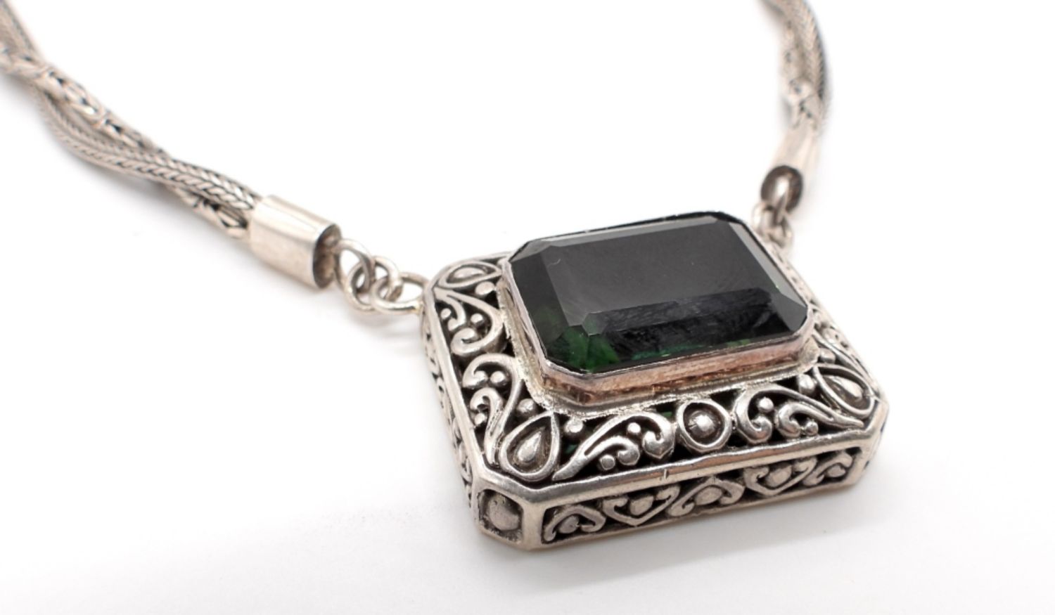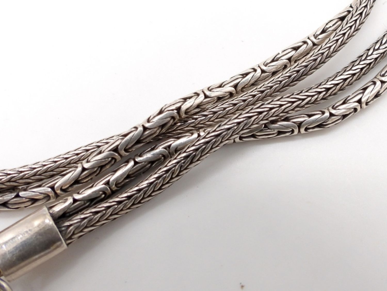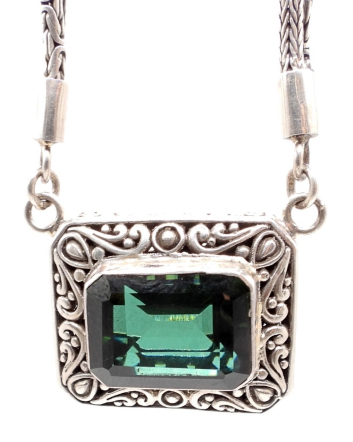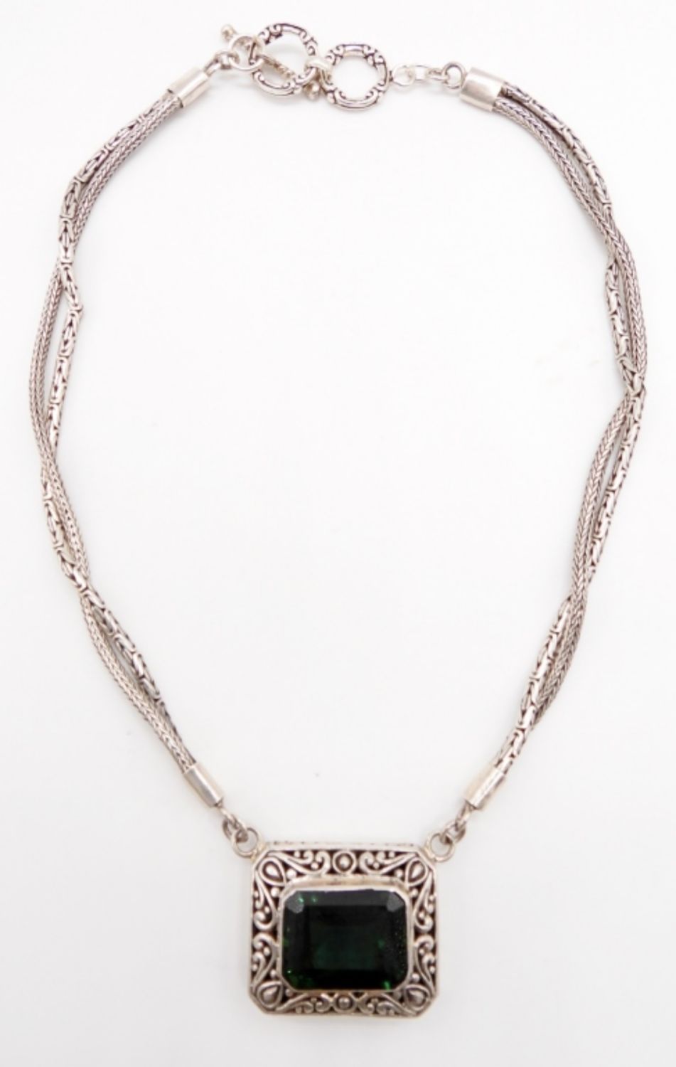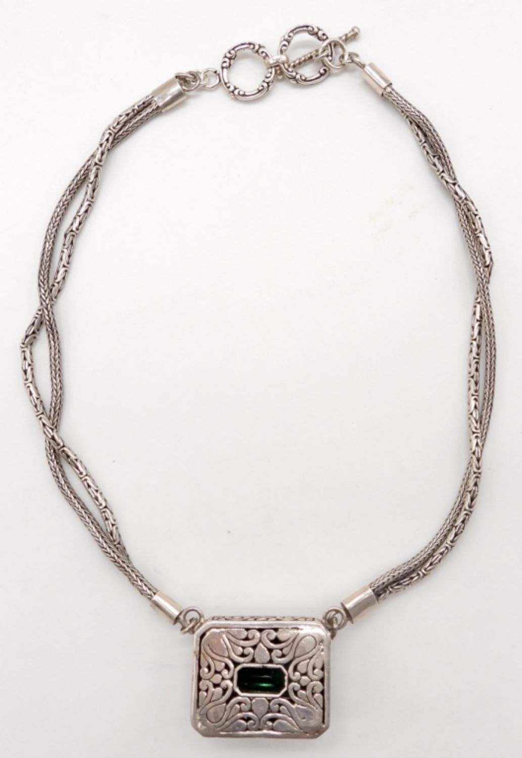 37DWT, 27IN LONG, TOGGLE CLASP, BYZANTINE AND FOXTAIL IN A TWIST WITH A EMERALD STONE IN THE MIDDLE, NO MARKINGS FOUND