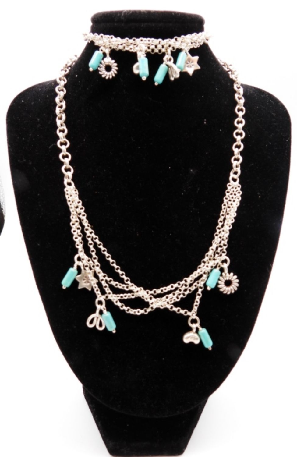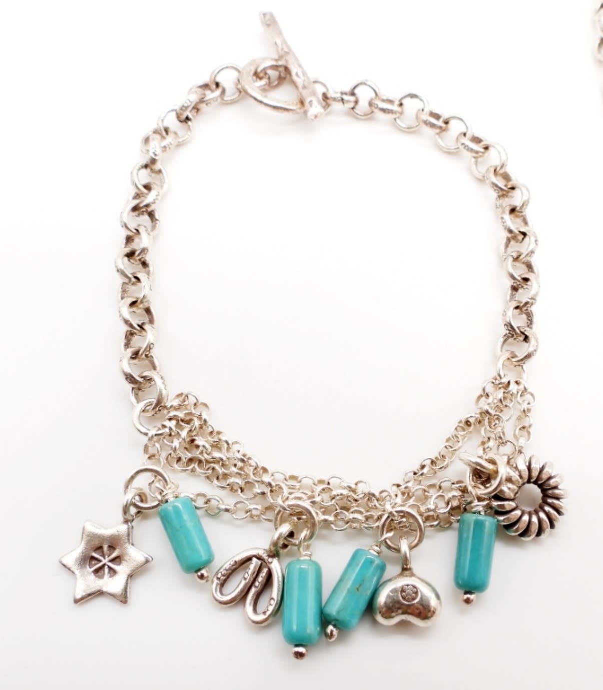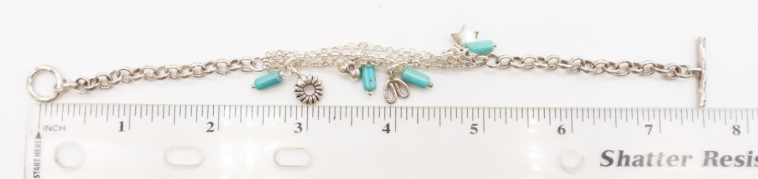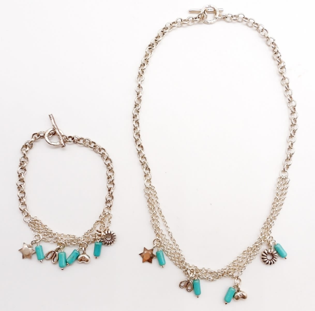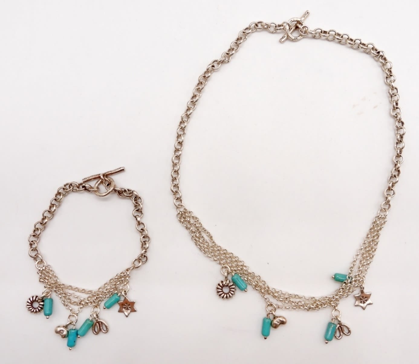 22.3DWT, 16IN LONG WITH TOGGLE CLASP STAMPED 925, 4 TURQUOISE BEADS WITH FLOWER, HEART, STAR CHARM, MATCHING BRACELET 7 1/2IN LONG, TOGGLE STAMPED 925