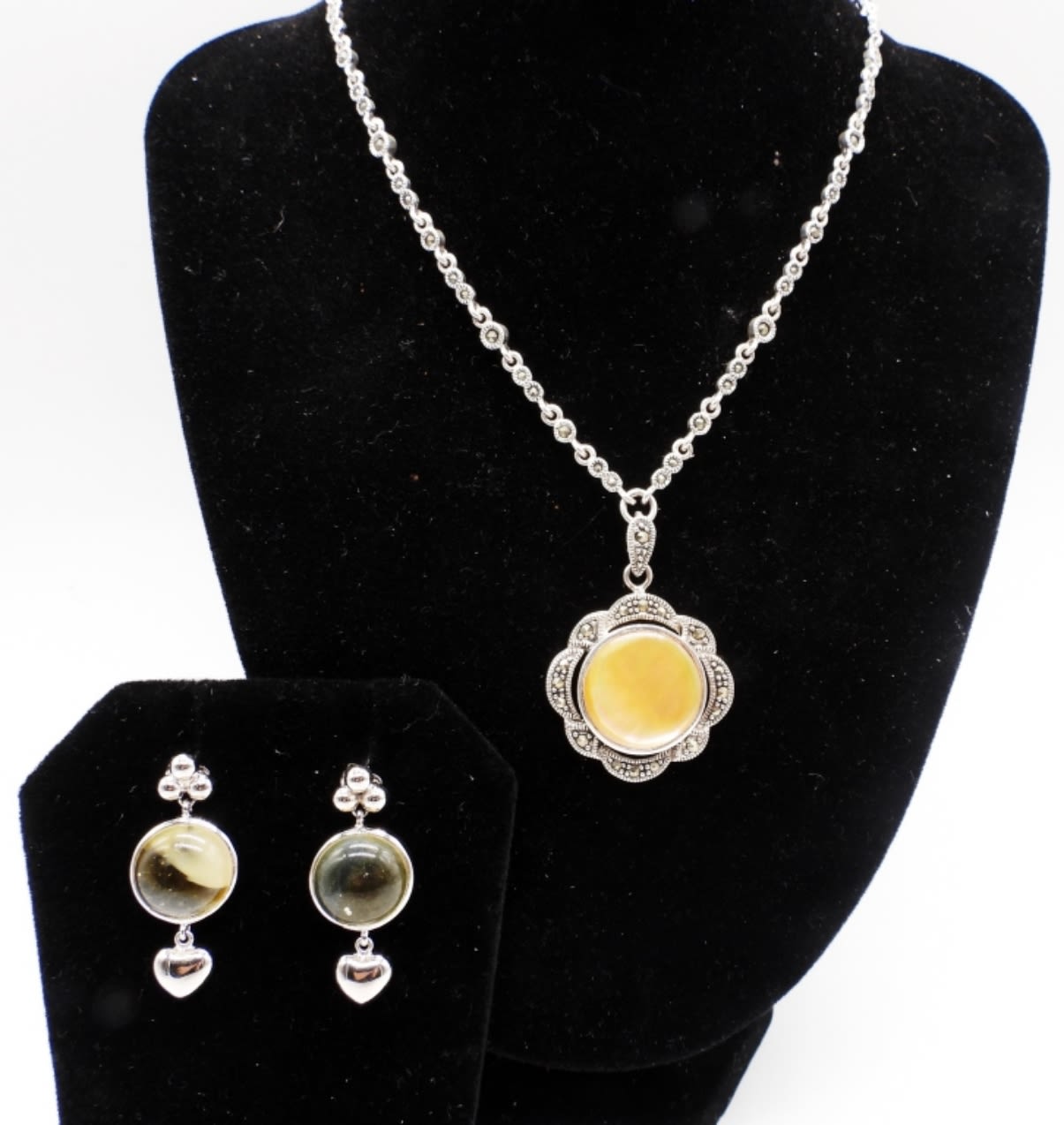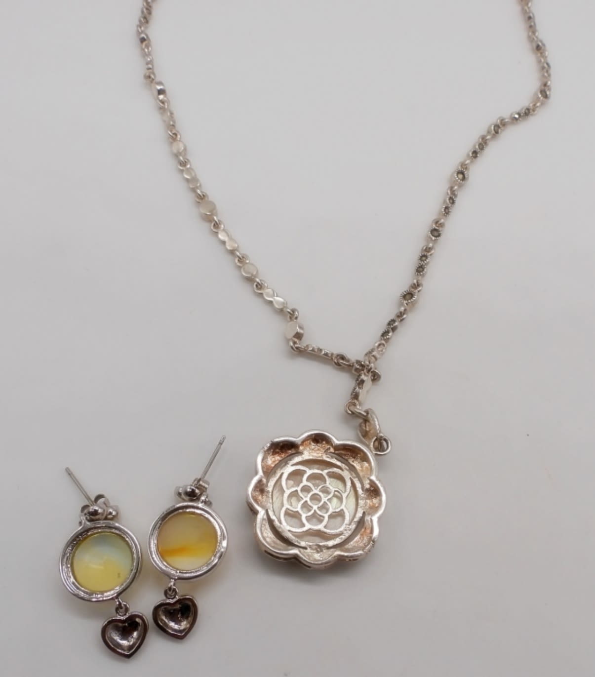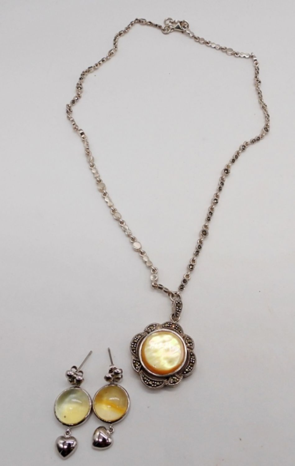 18.2 DWT STERLING SILVER MATCHING NECKLACE & EARRINGS, NECKLACE IS 18″ WITH MARCASITE, NATURAL STONE