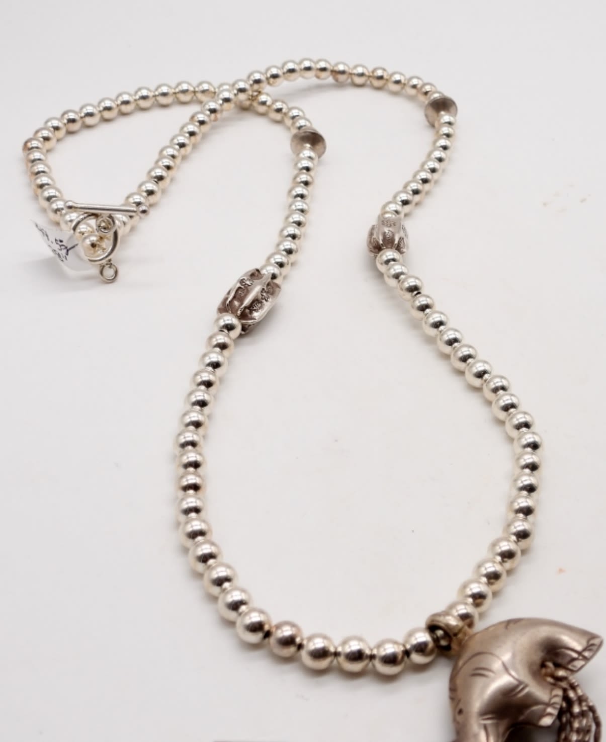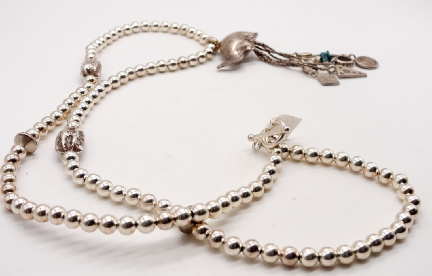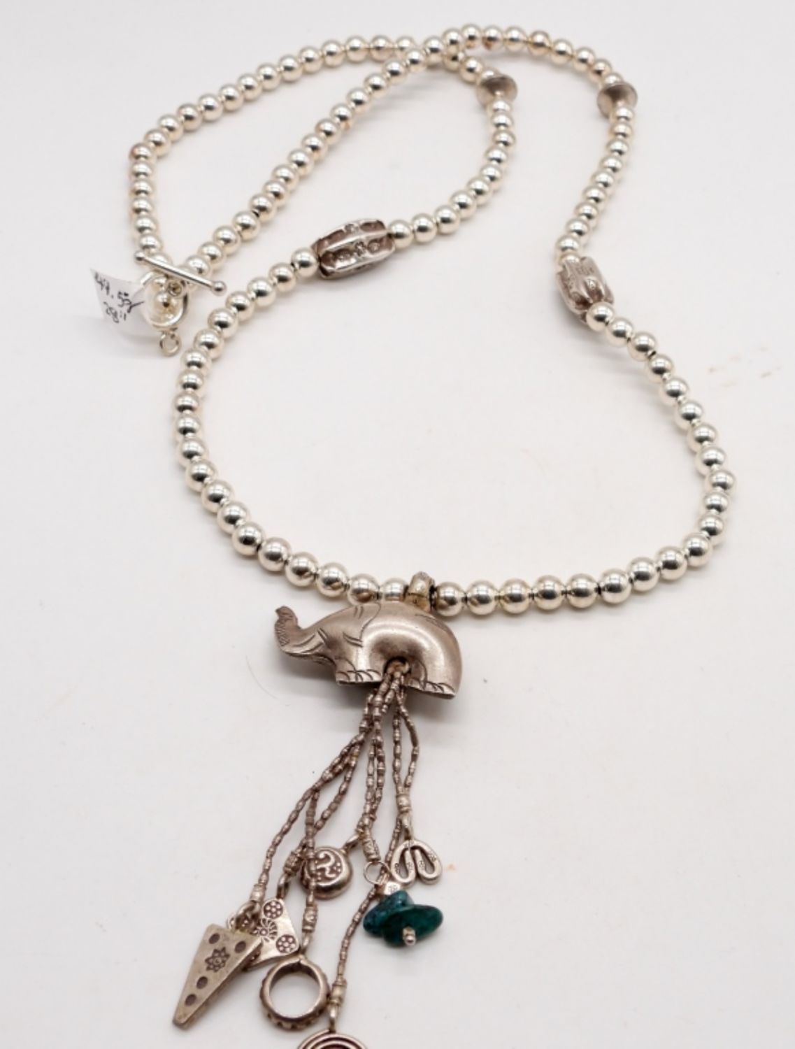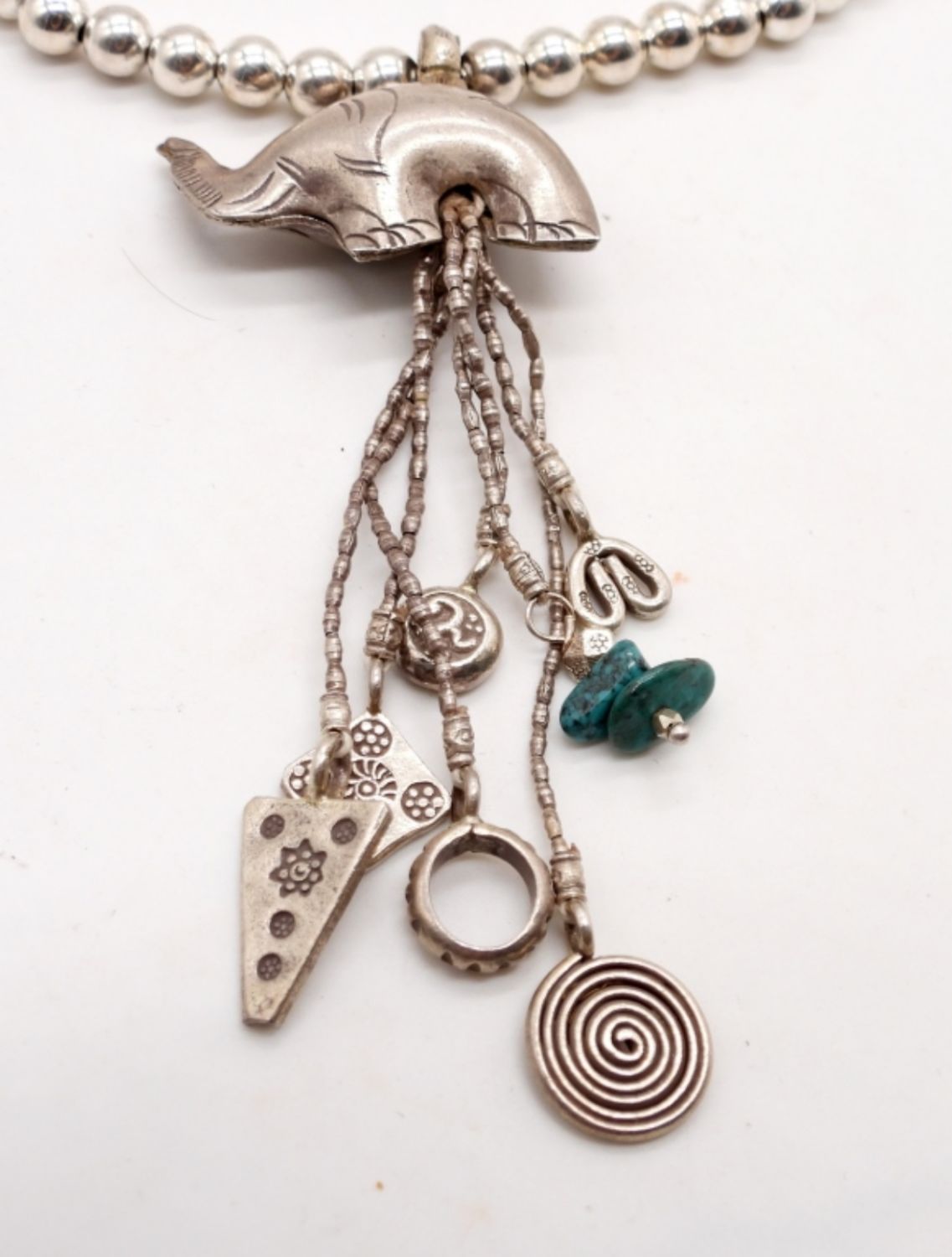 33 DWT STERLING SILVER SOUTHWEST STYLE BEADED NECKLACE WITH DANGLING TURQUOISE CHIPS AND CHARMS