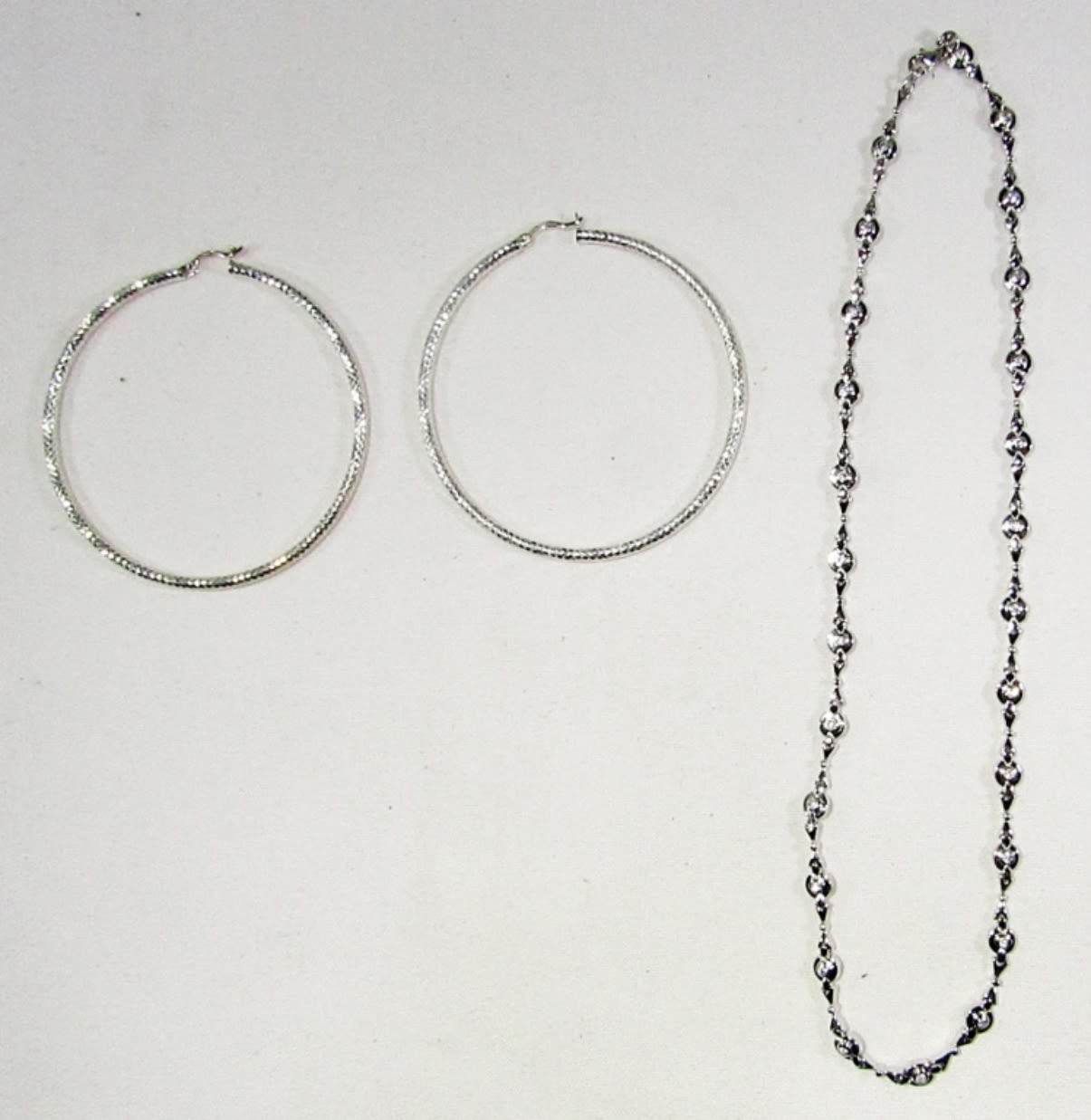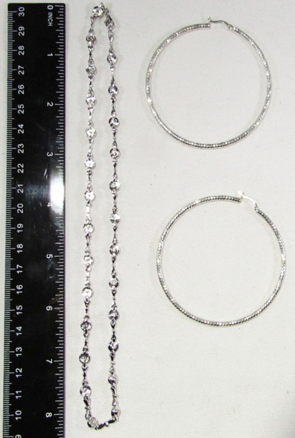 17.7 DWT, STERLING SILVER LARGE HOOP EARRINGS, 17 INCH NECKLACE WITH TINY CLEAR GEMSTONES