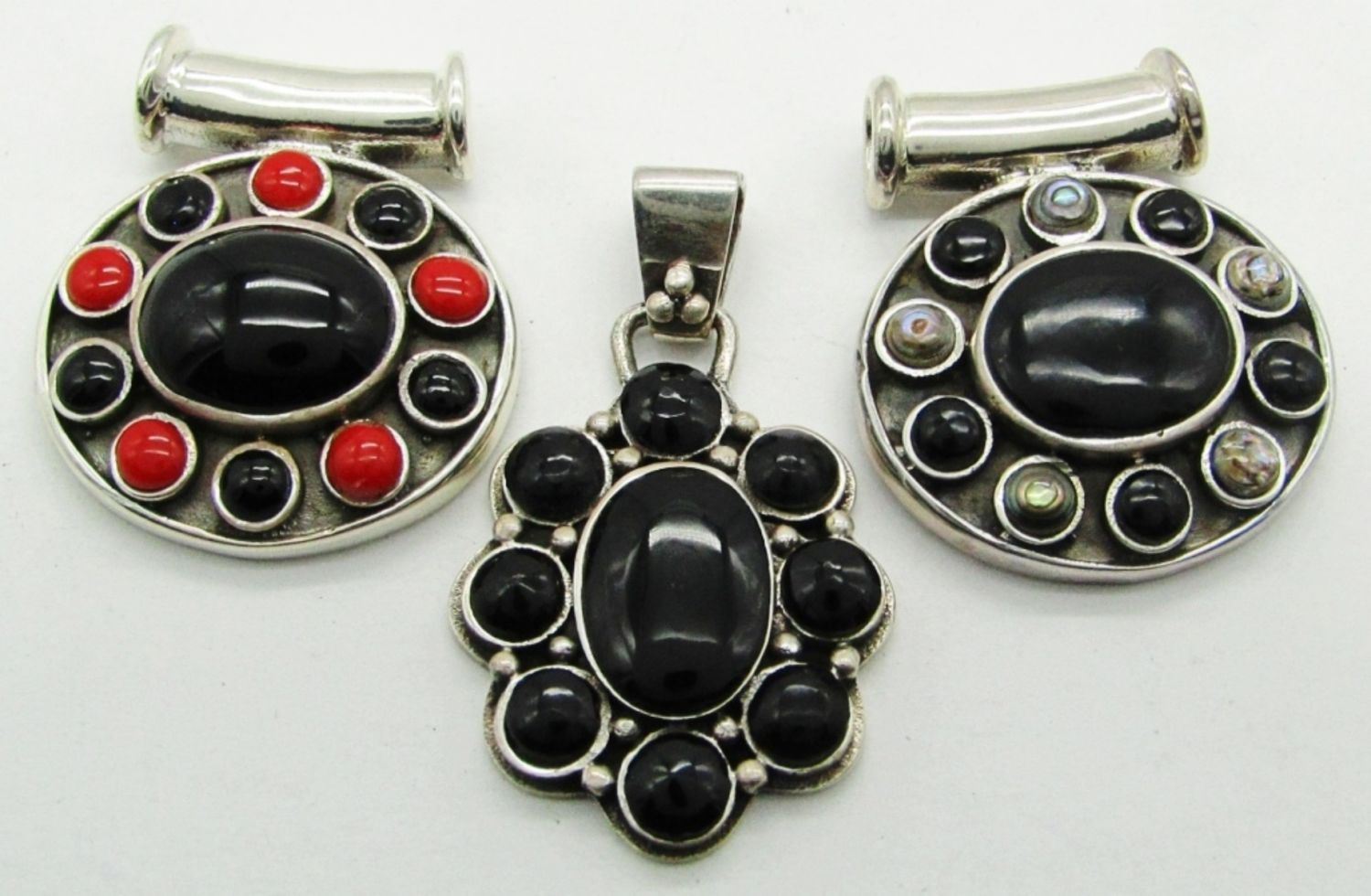 19DWT, NEAR 2IN LONG, BLACK ONYX, CORAL, MOONSTONE BEADS MAKE UP THESE PENDANTS, ALL STAMPED 925 ON THE BACK