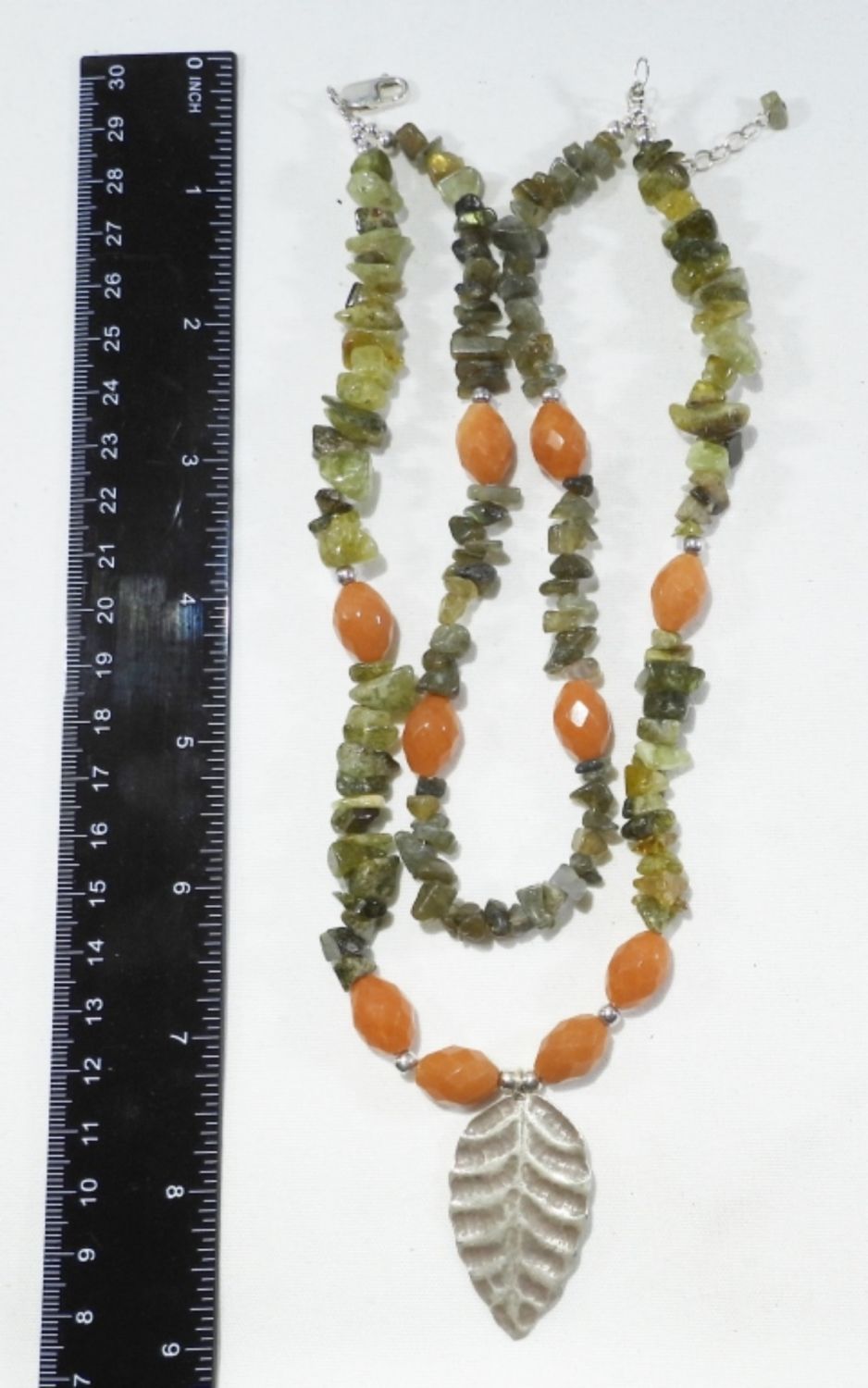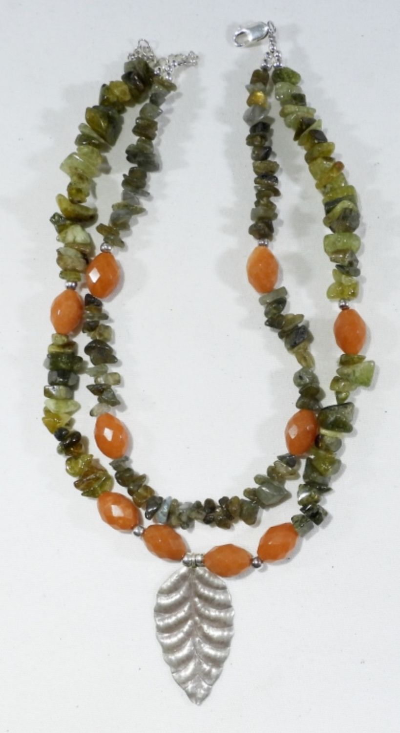 LARGE CHUNKY STERLING FASHION NECKLACE, SILVER LEAF, AMBER AND GREEN GEMSTONES