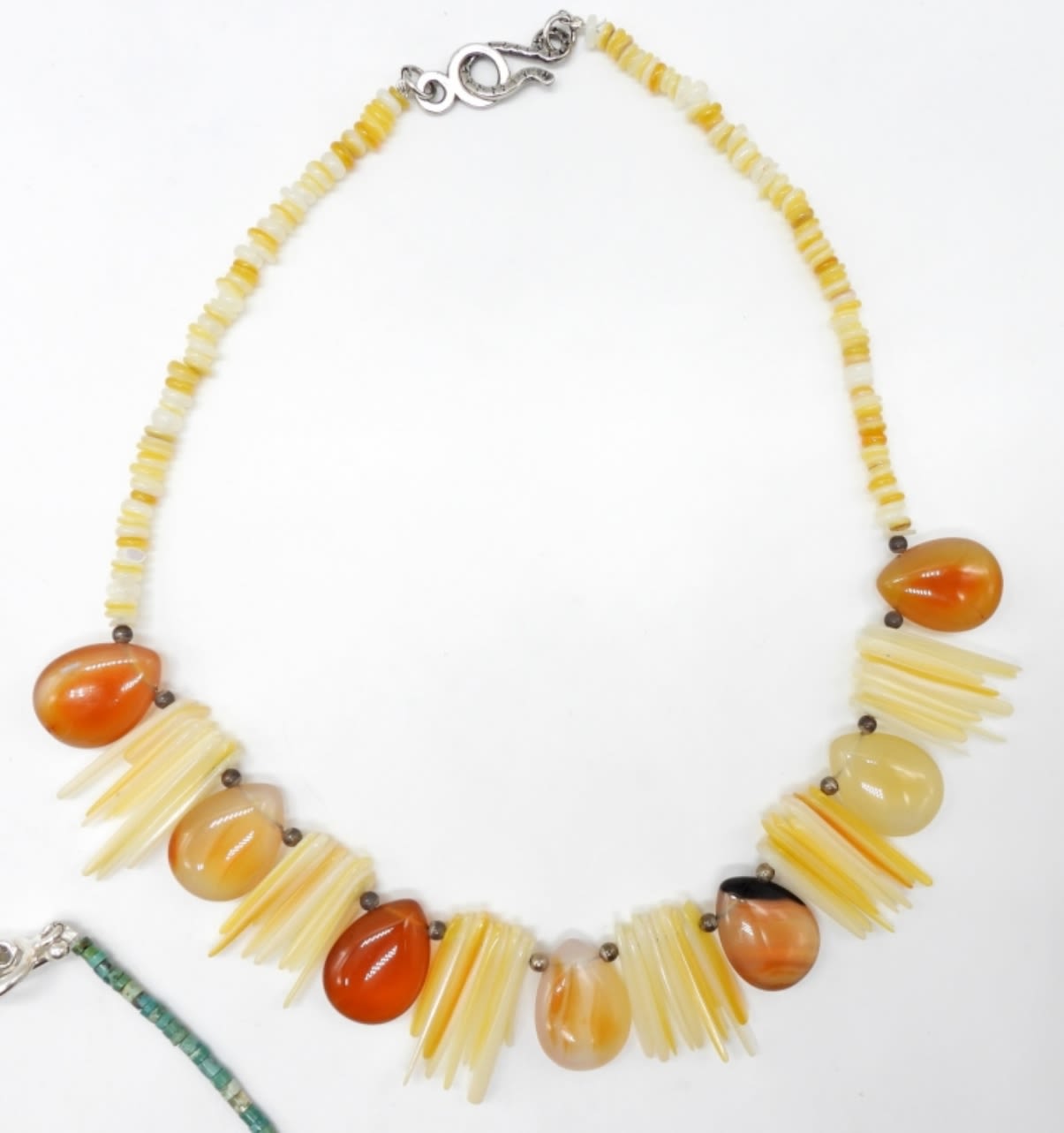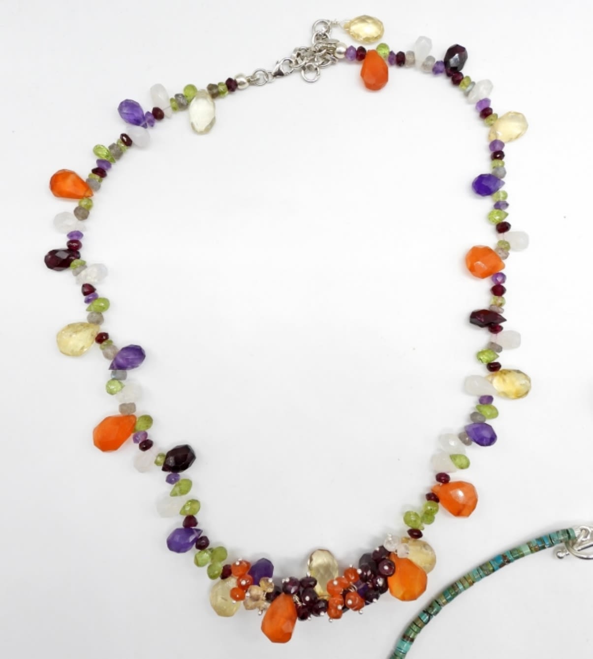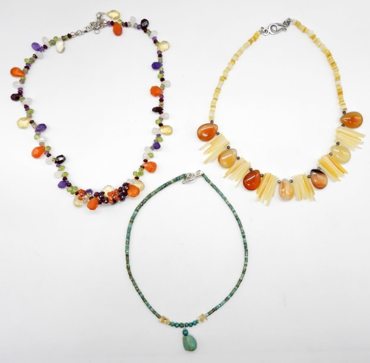 15″ Marked 925 IW Sterling, Green Turquoise Beads; 16″ Carnelian Stones, Beads; 19″ Marked 925 Multi-Color Stones, Beads.