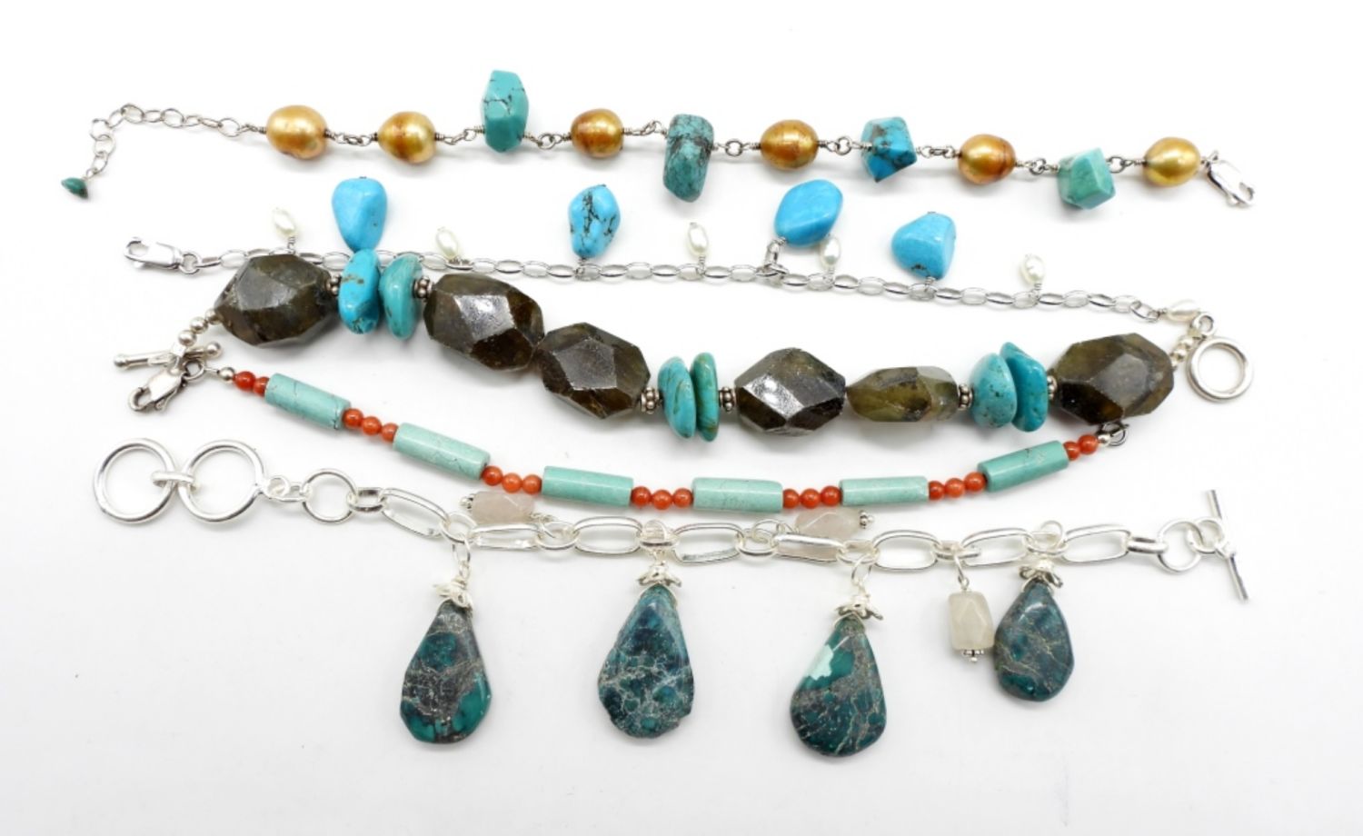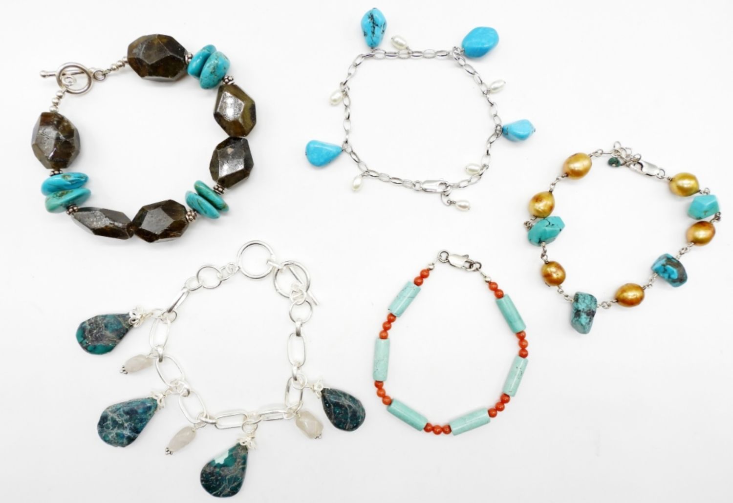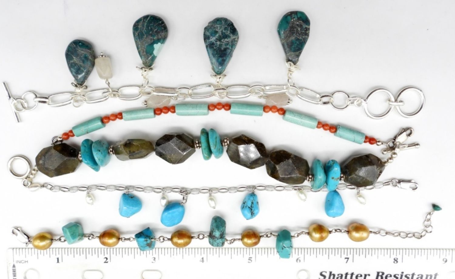8″ Sterling & Turquoise; 7″ Turquoise & Carnelian/Coral; 7″ Sterling & Turquoise; 9″ Sterling & Turquoise & Pearls; 8″ Sterling & Turquoise & Stones.