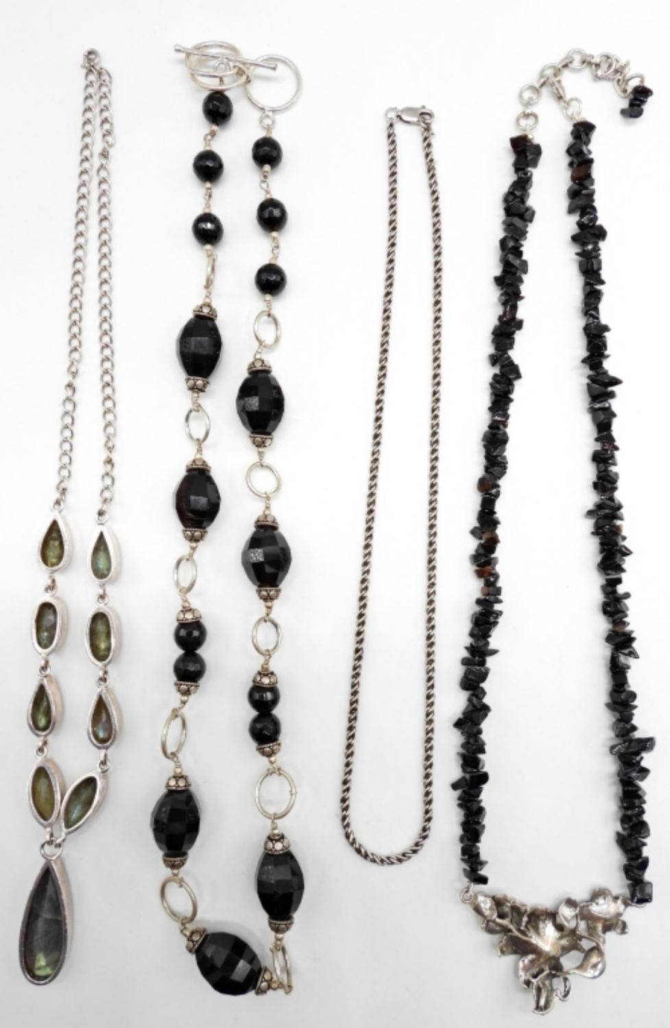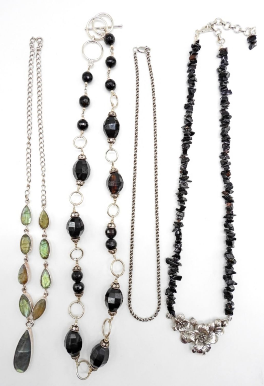 20″ Sterling, Black Beads; 16″ Marked 925 Sterling, Gemstone Drops; 20″ Marked 925 Sterling With Black Seed Beads & Flower Pendant; 16″ Marked 925 Sterling Braided Rope. 68 dwt.