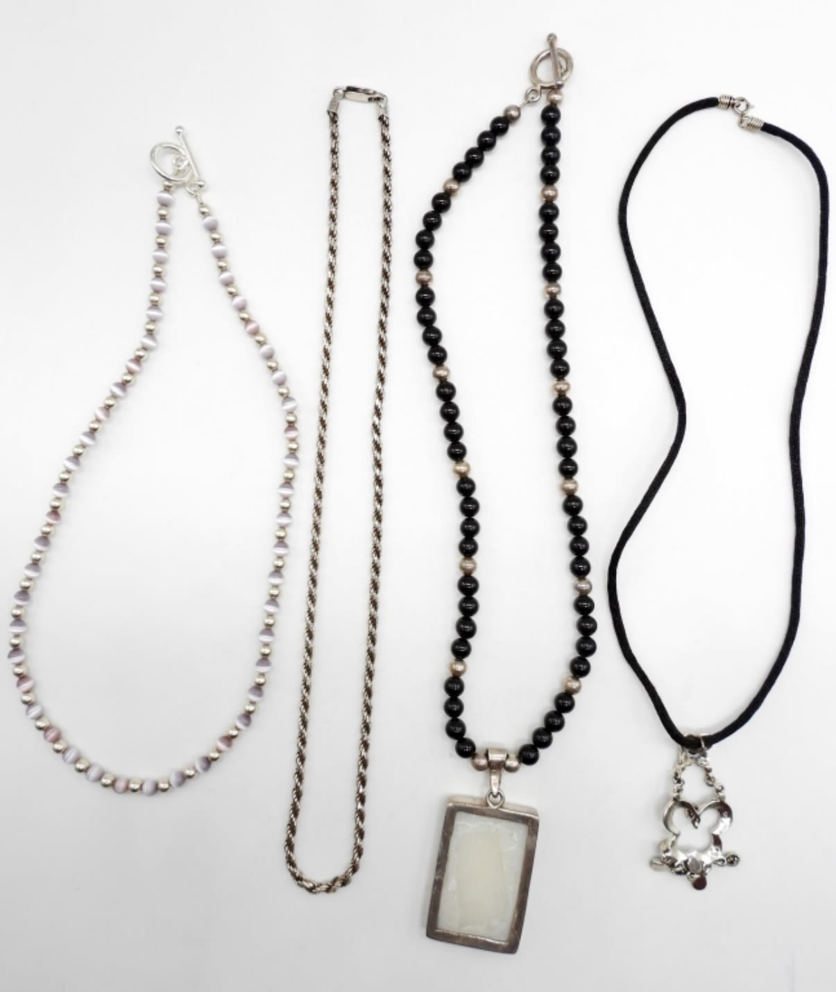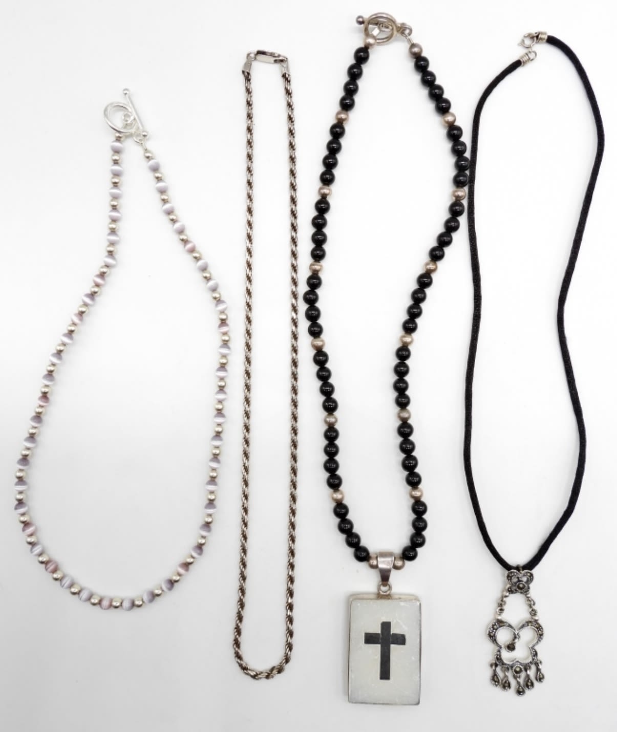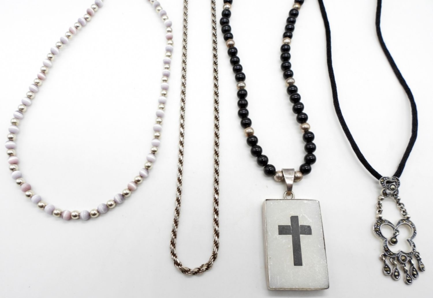15″ Marked 925 India Sterling, Beads; 16″ Marked 925, Black Rope With 1.5″ Marcasite Pendant; 17″ Marked 925 Italy Braided Rope Chain; 16″ Marked 925 Sterling & Beaded with 1.5″ Cross Pendant.