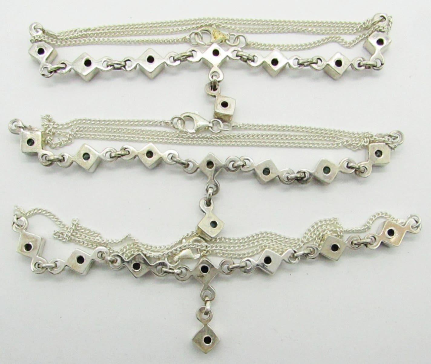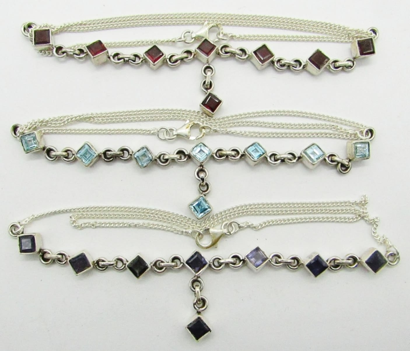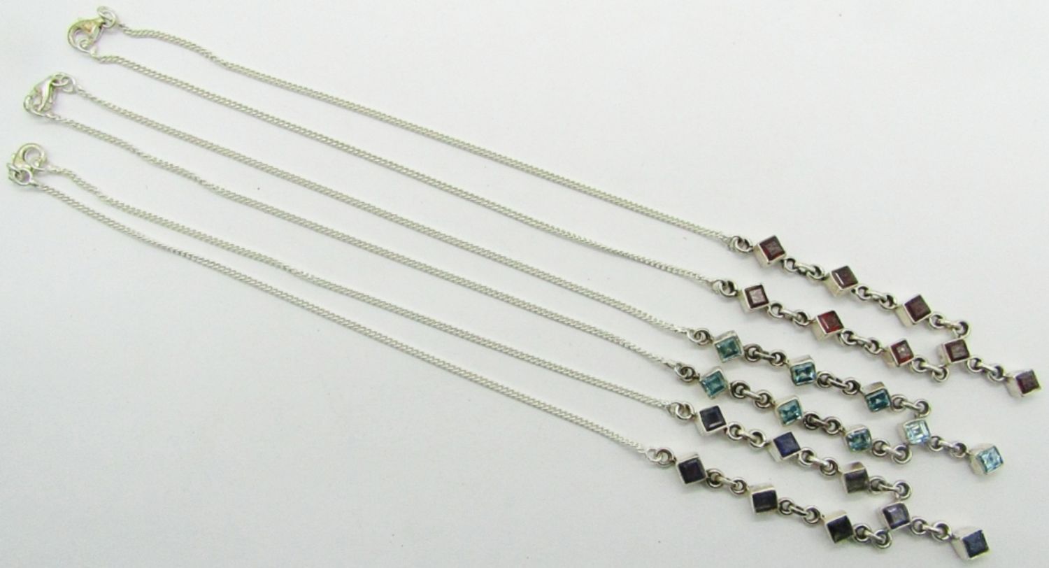 23.8, ALL 18IN LONG WITH LOBSTER CLASP, STAMPED 925 ON CLASP, RED, BLUE AND PURPLE GEMSTONES