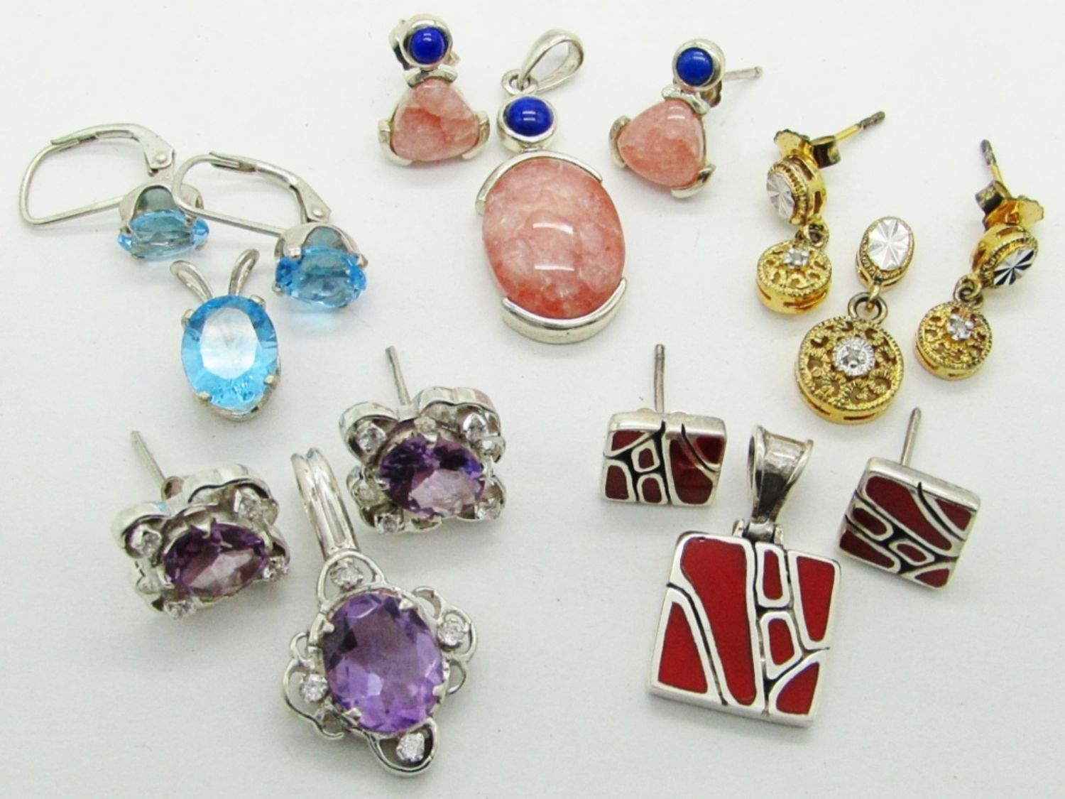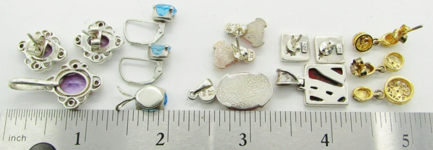 20DWT, ALL PENDANTS ARE LITTLE OVER 1IN, ALL STAMPED 925 ON THEM, EARRINGS ARE PIERCED STUD STYLE