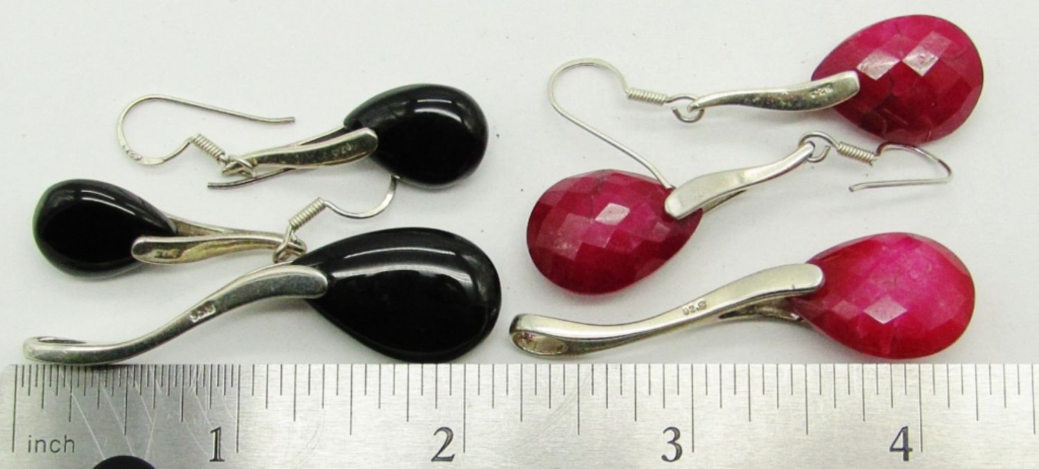 17.5DWT,1 SET IS A RUBY STONE AND 1 IS A BLACK ONYX SET, EARRINGS ARE PIERCED AND DANGLED, ALL ARE STAMPED WITH 925