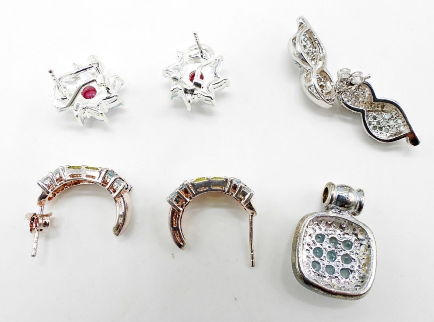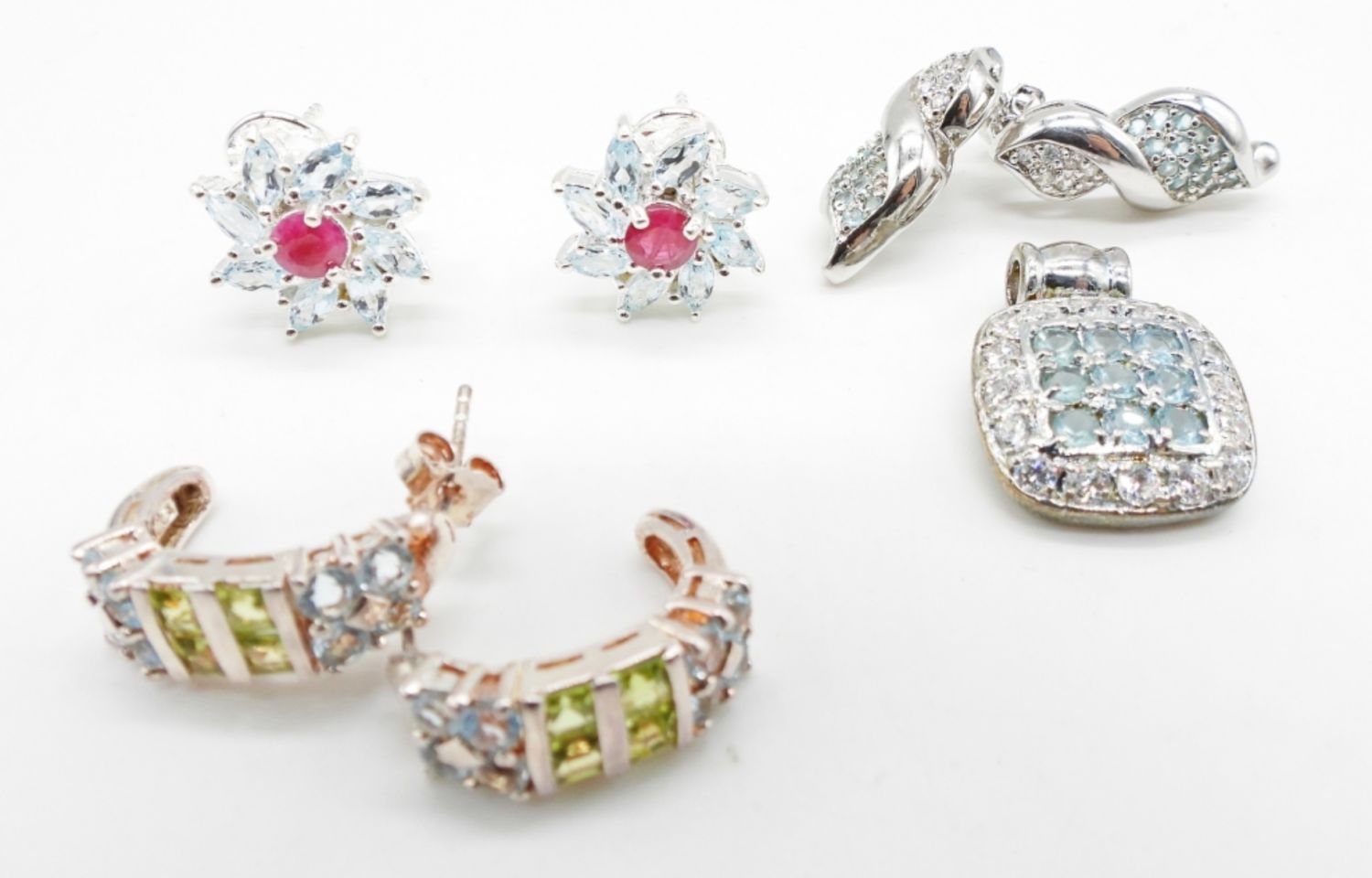 16.5DWT, PIERCED EARRINGS, BLUE, RED, GREEN STONES MAKE EACH SET, PENDANT IS 1IN LONG WITH BLUE STONES, ALL STAMPED 925