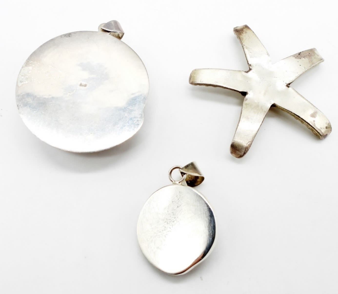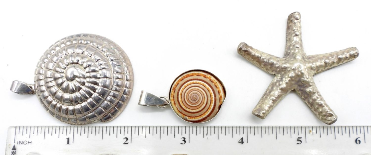 20DWT, BETWEEN 1 1/2IN TO 2IN LONG, STARFISH-NO STAMPING, LARGE SHELL STAMPED 925 ON THE BACK, SMALL SHELL STAMPED 925 ON THE BACK