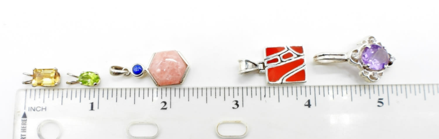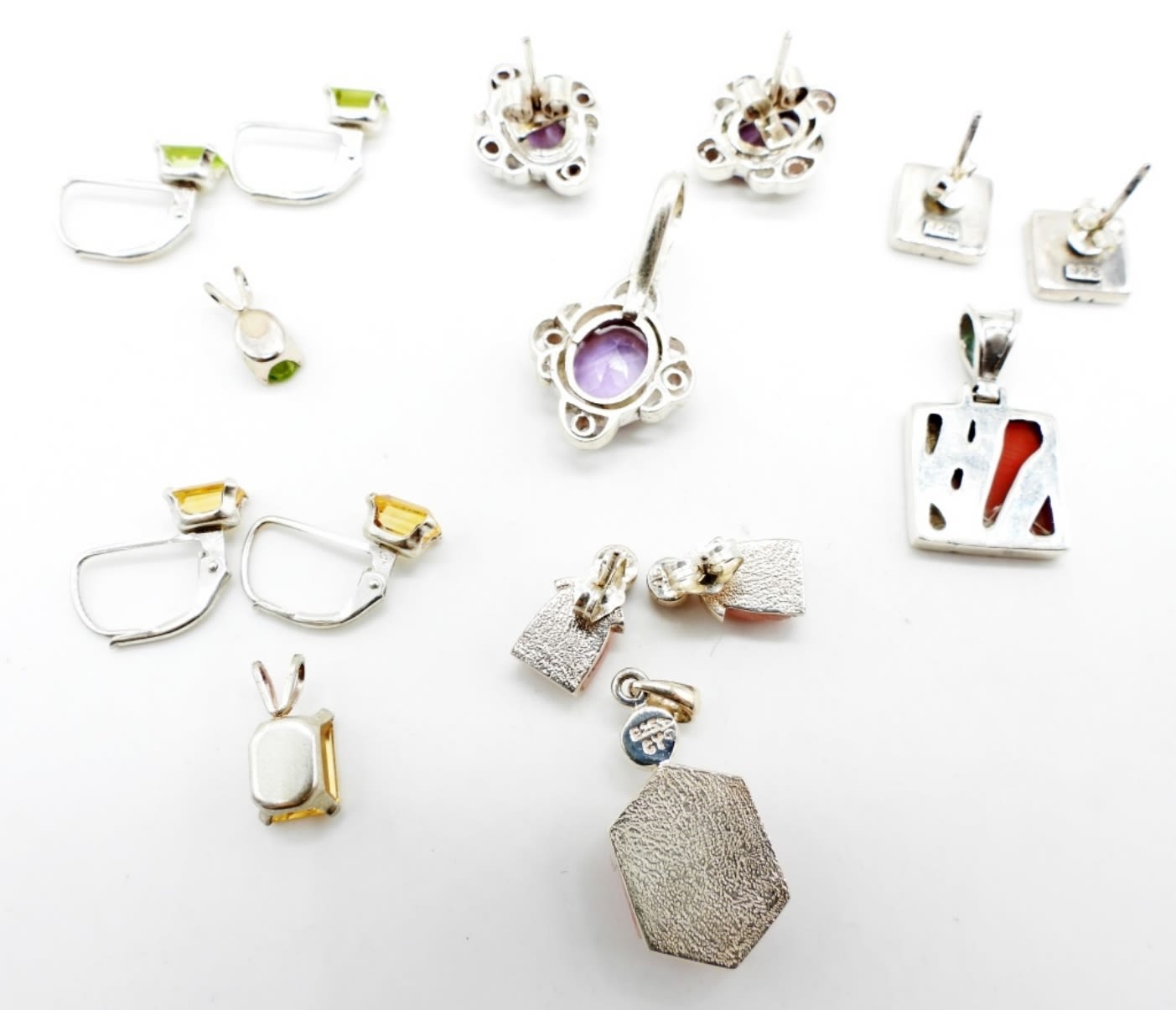 17DWT, PENDANT ARE BETWEEN 1/2 – 1IN LONG, PIERCED STUDS, 3 SET ARE STAMPED 925