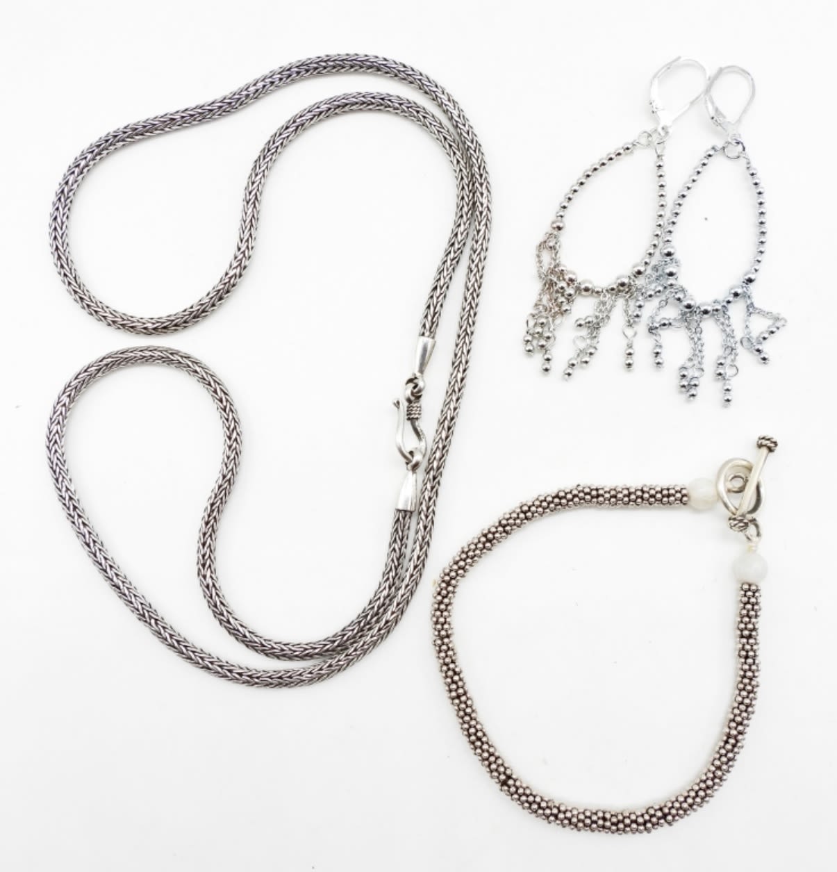 30DWT,24IN LONG STAMPED 925 ON HOOK CLASP (FOXTAIL STYLE), 7 1/2IN LONG BRACELET WITH TOGGLE CLASP NO STAMPING, PIERCED DANGLED EARRINGS STAMPED 925