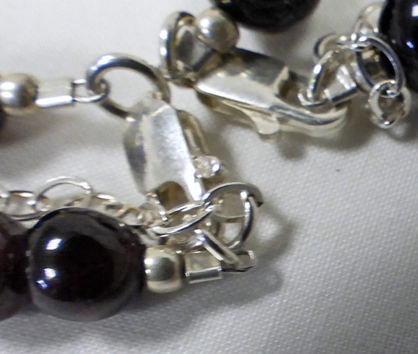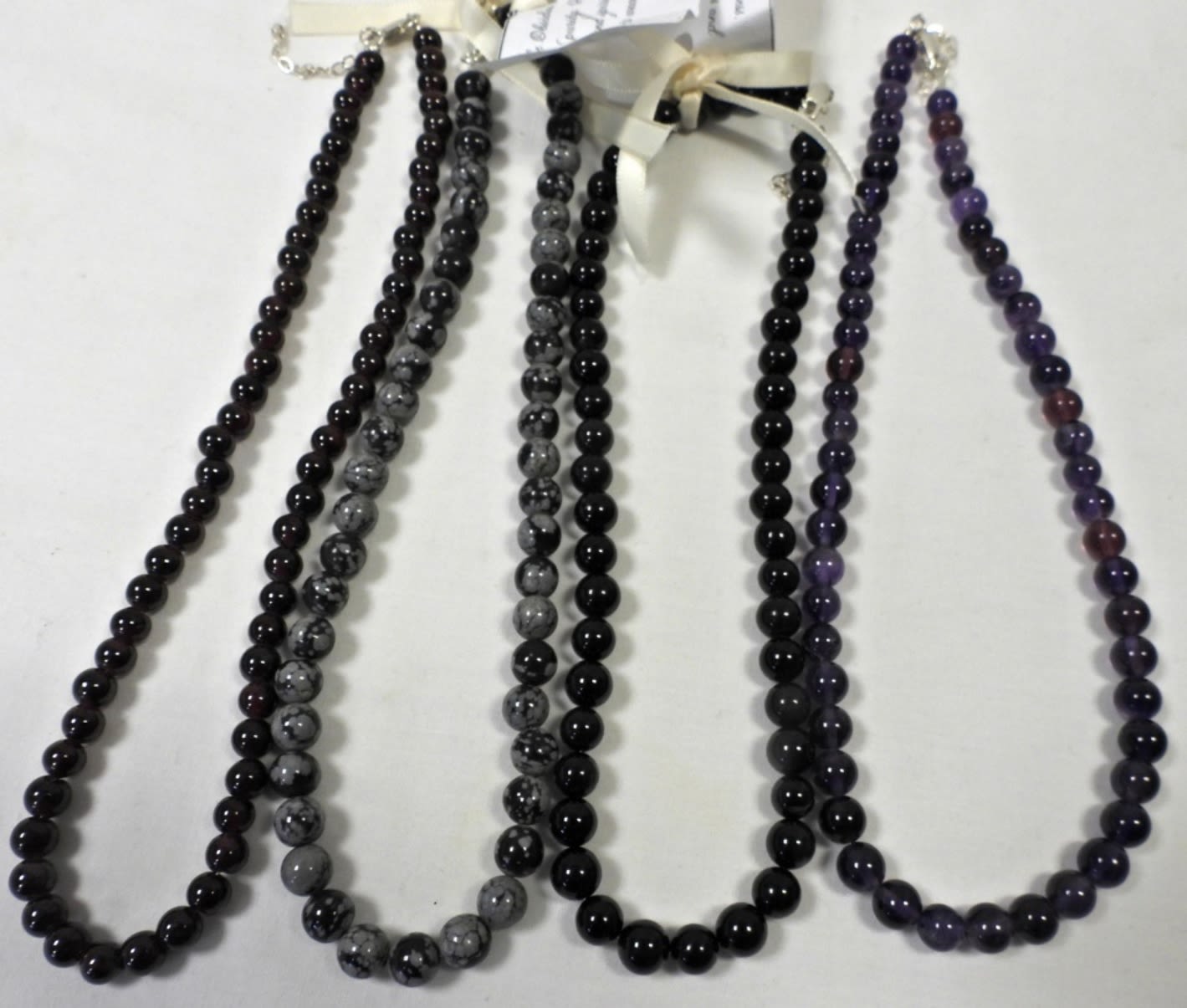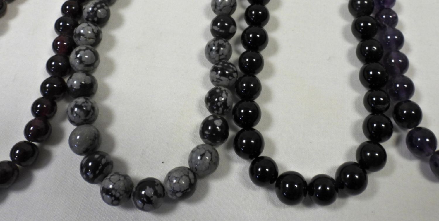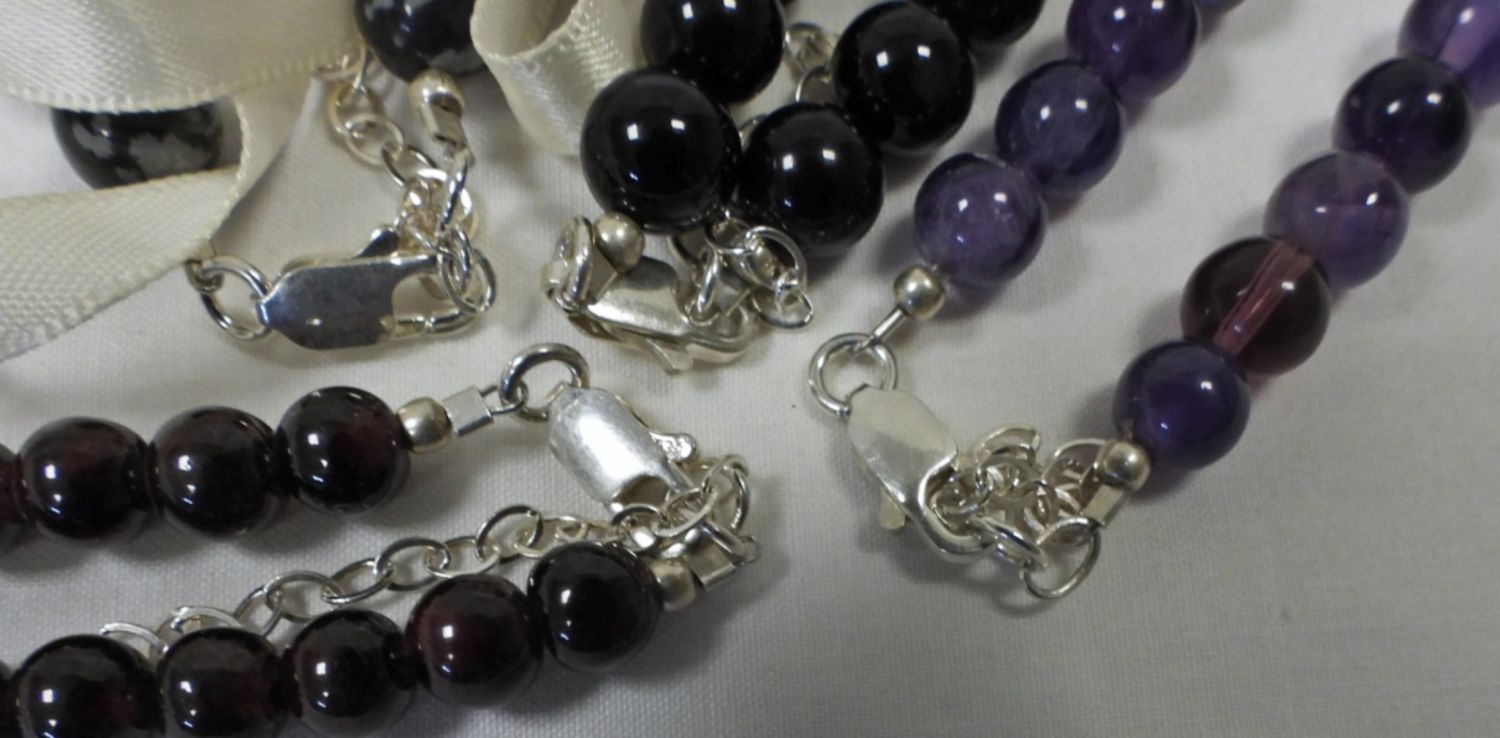 WITH STERLING CLASP – ONYX, SNOWFLAKE OBSIDIAN, PURPLE STONE & DARK RED PURPLE – ALL 16″ LONG