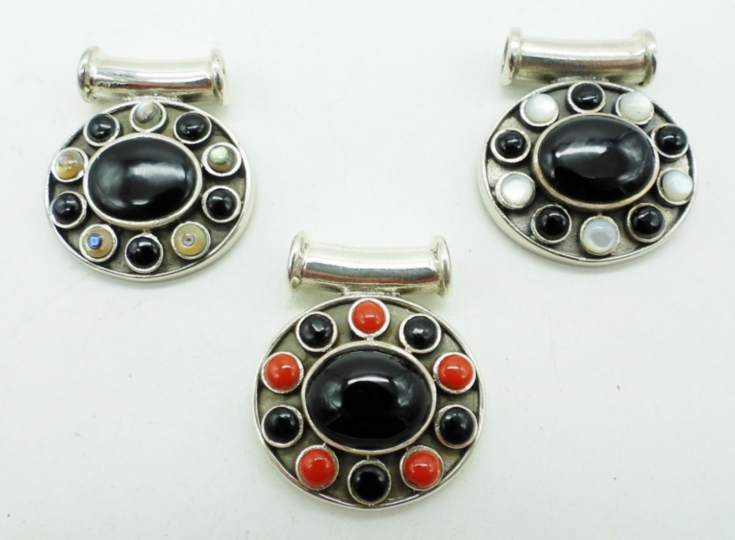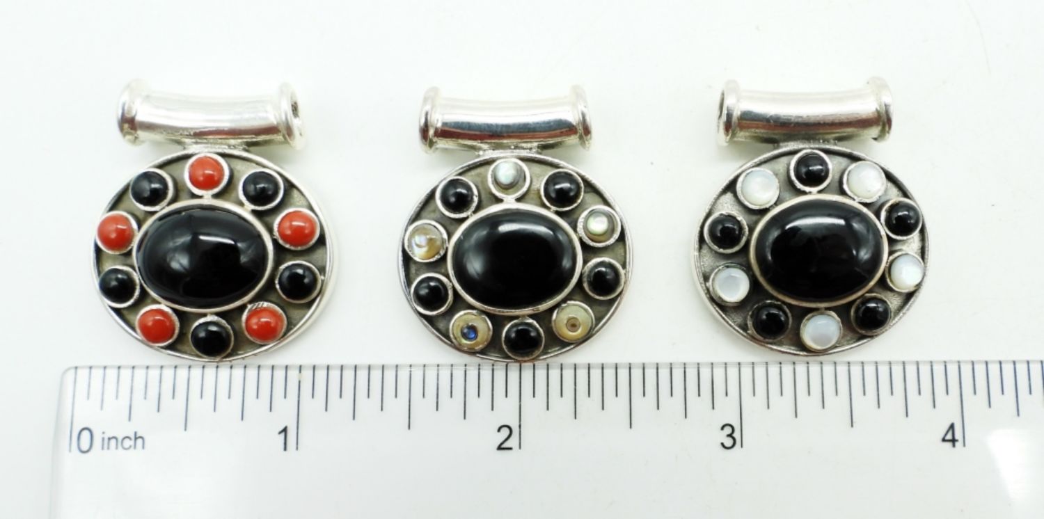 20.6DWT,1 1/2IN LONG, STAMPED 925, BLACK ONYX IS ON EACH PENDANT WITH MOTHER OF PEARL, ABALONE AND RED