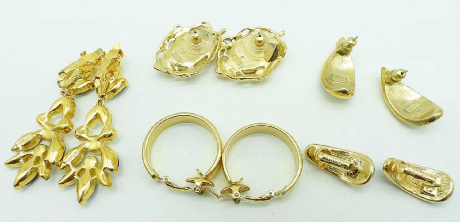 ALL PAIRS ARE GOLD TONE, 2 PIERCED MEDIUM STUDS, 1 HOOP CLIP-ON, 1 STUD CLIP-ON, AND 1 DANGLED CLIP-ONS