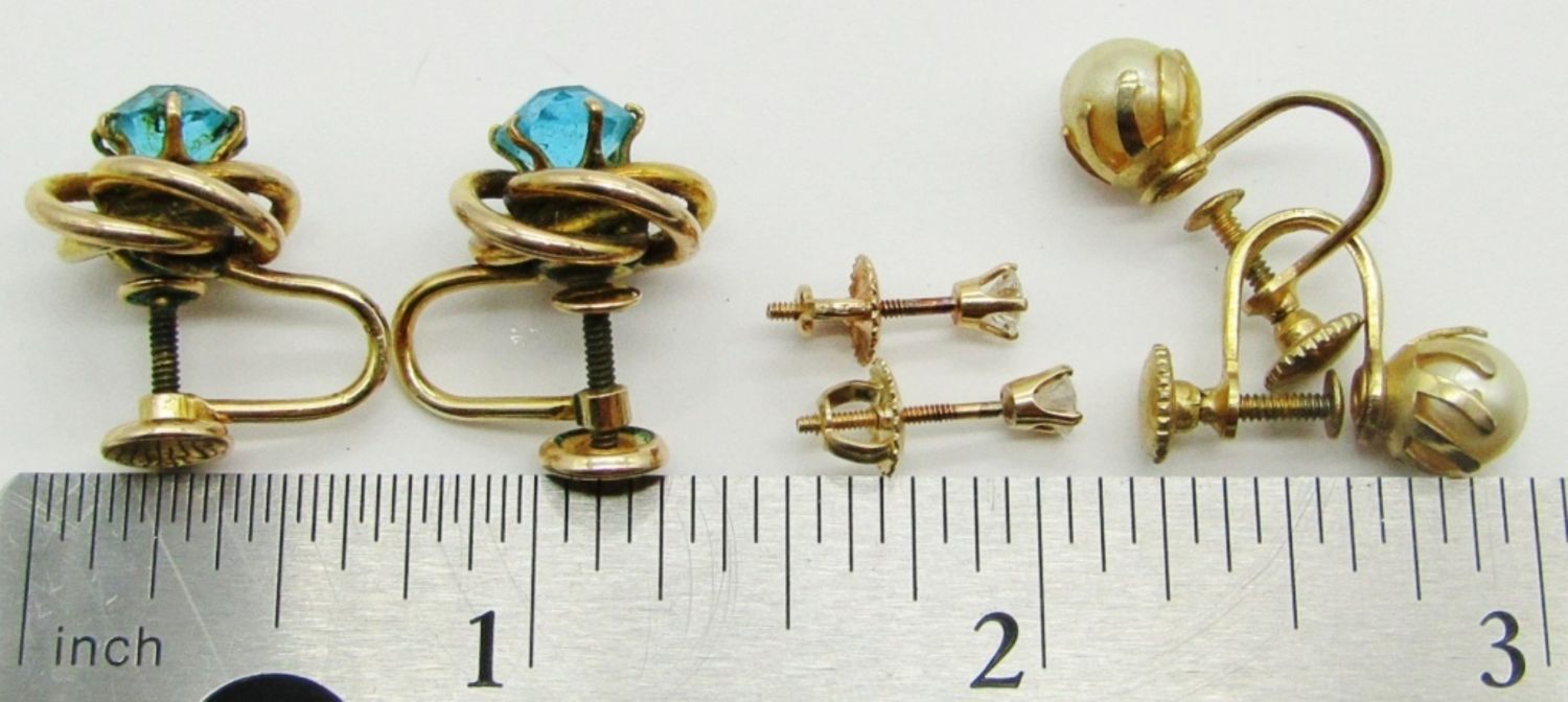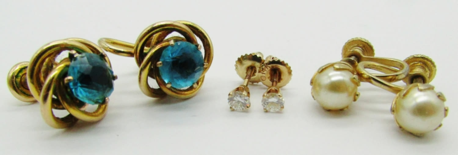 ALL STUD STYLE. (1) BLUE RHINESTONE MARKED “B&N”, (1) FAUX PEARL, (1) CLEAR GEMS BACKING MARKED 14K.