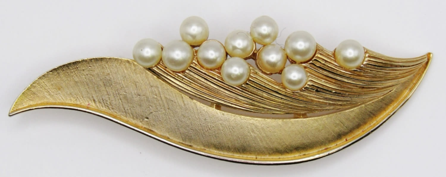 3″ GOLD TONE & TEXTURED, WITH FAUX PEARLS. SIGNED ON BACK.