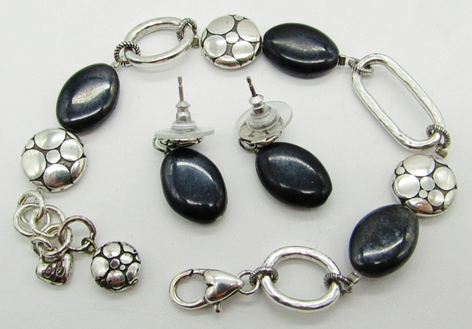 BLACK & TEXTURED SILVER TONE 8″ BRACELET MARKED “B” ON HANG TAG & PIERCED DANGLE EARRINGS.