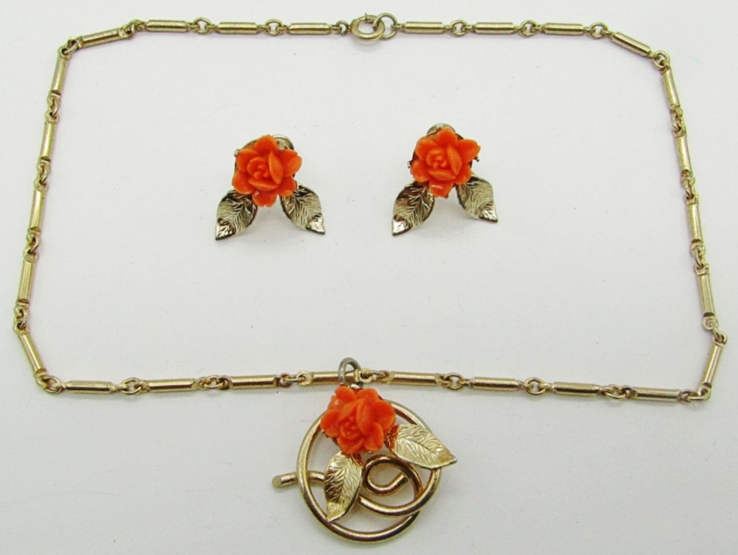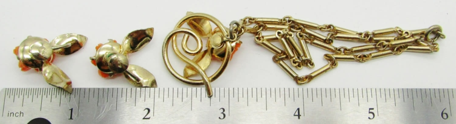 GOLD TONE & ORANGE ROSE 16″ NECKLACE & SCREW BACK EARRINGS. SIGNED ON BACK OF EARRINGS