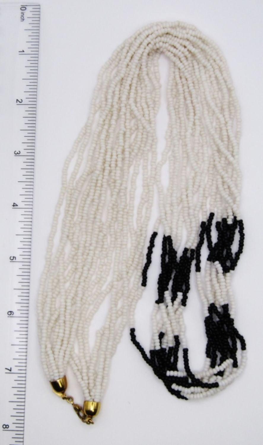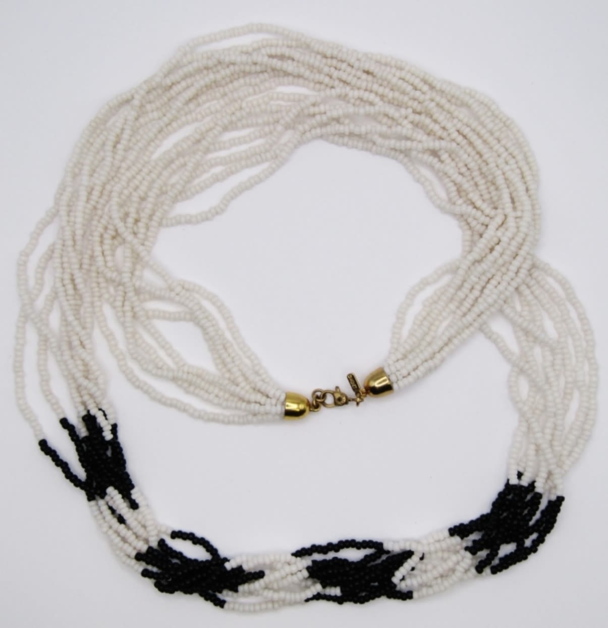 29″ BLACK & WHITE 8-STRAND NECKLACE. GOLD TONE END CAPS. SIGNED MONET ON LOBSTER CLAW AND HANGTAG.