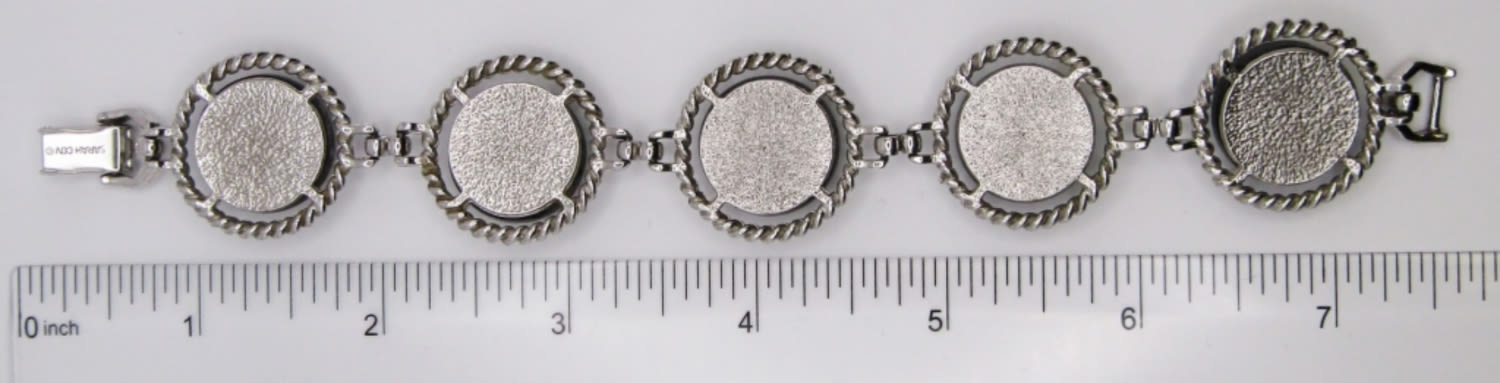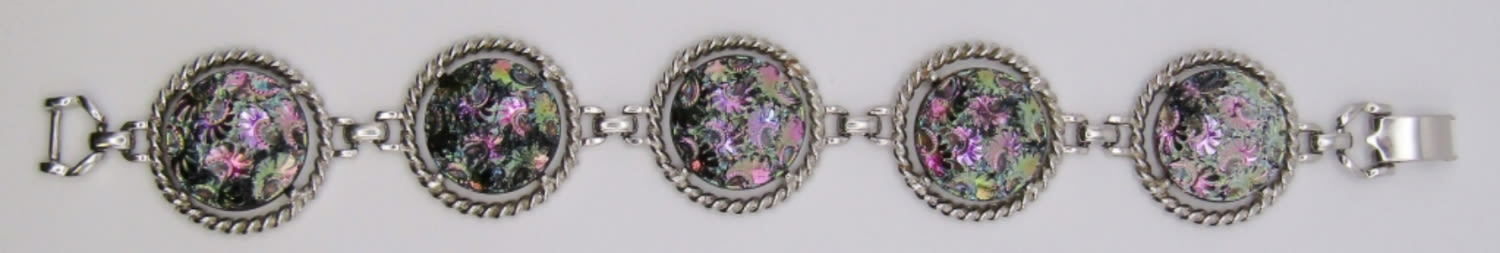7.5″ VINTAGE SARAH COVENTRY SILVER TONE BRACELET, IRIDESCENT BUTTON STYLE. SIGNED ON BACK OF CLASP.