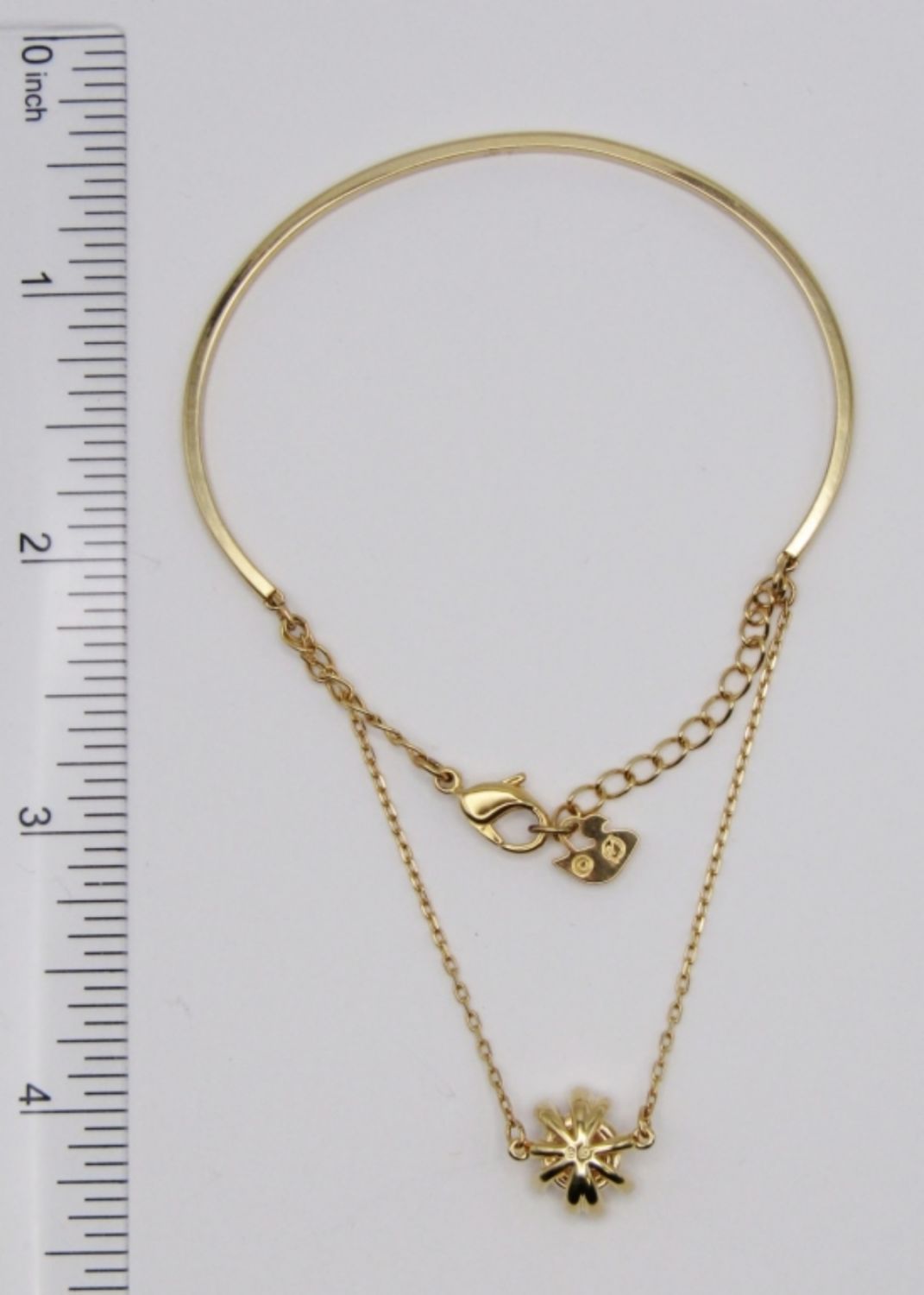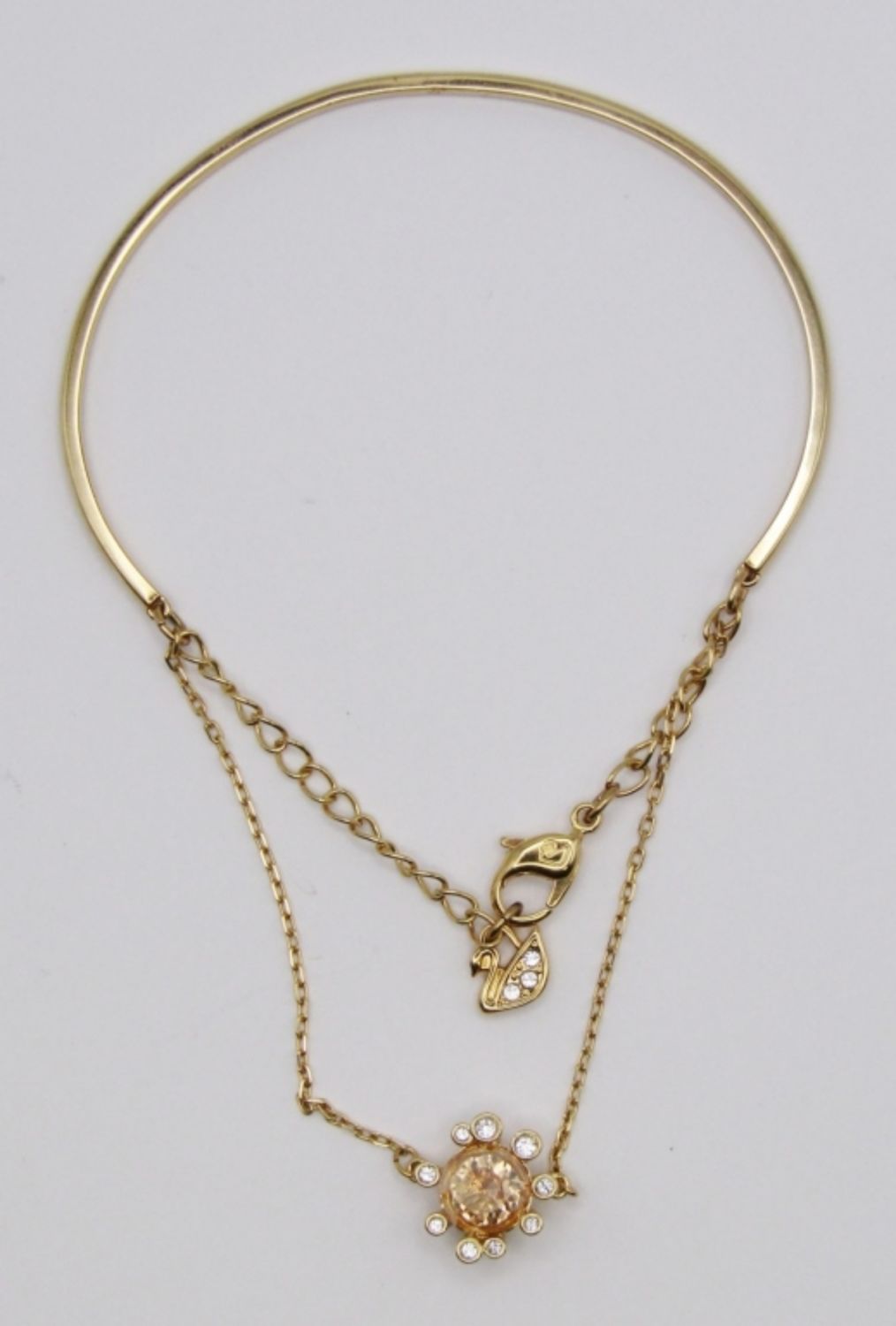 2.25″ DIAMETER GOLD TONE BANGLE WITH CHAIN, ORANGE & CLEAR STONES. NONE MISSING. SIGNED ON CLASP AND HANGTAG.