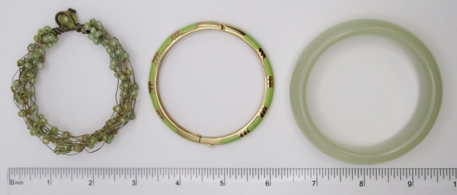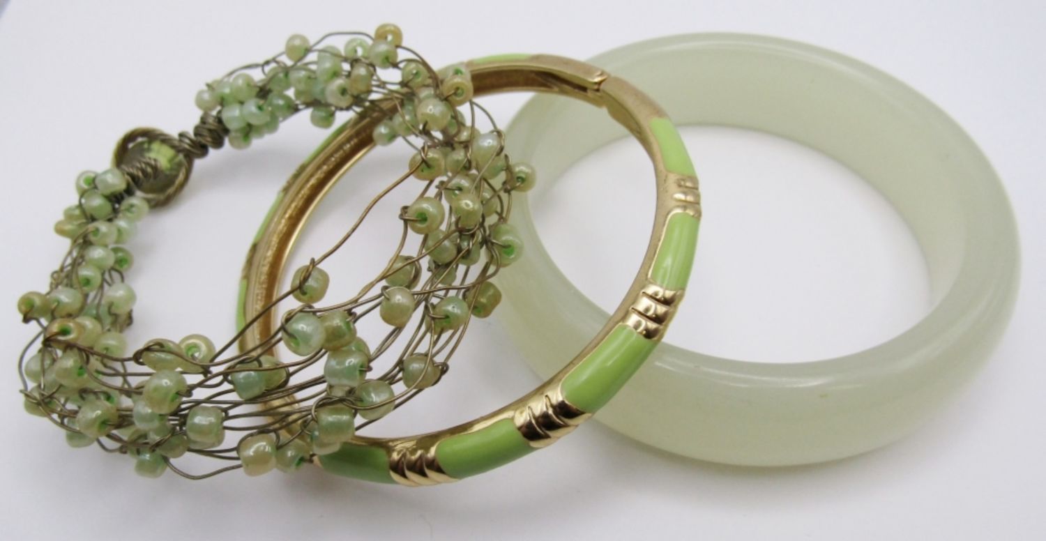 ALL 2.25″ DIAMETER. (1) SOLID BANGLE, (1) BEADED WIRE W/ LOOP CLOSURE, & (1) HINGED GOLD TONE. CUTE ALONE OR LAYERED!