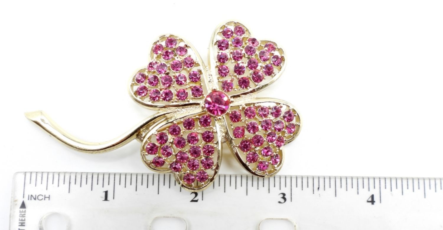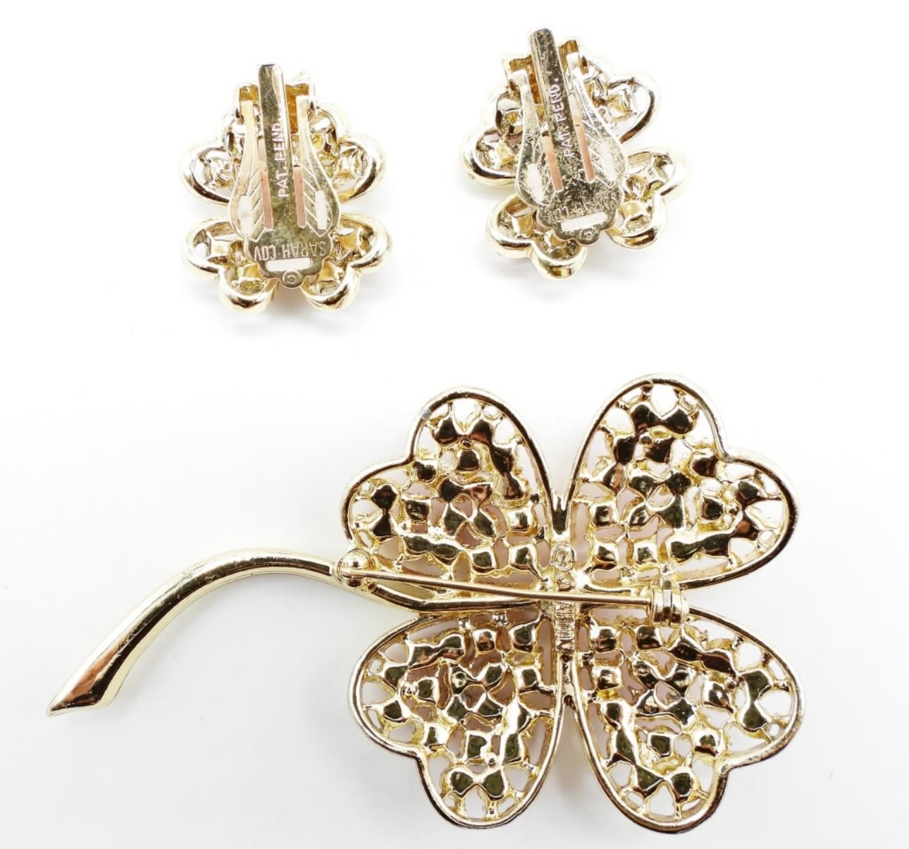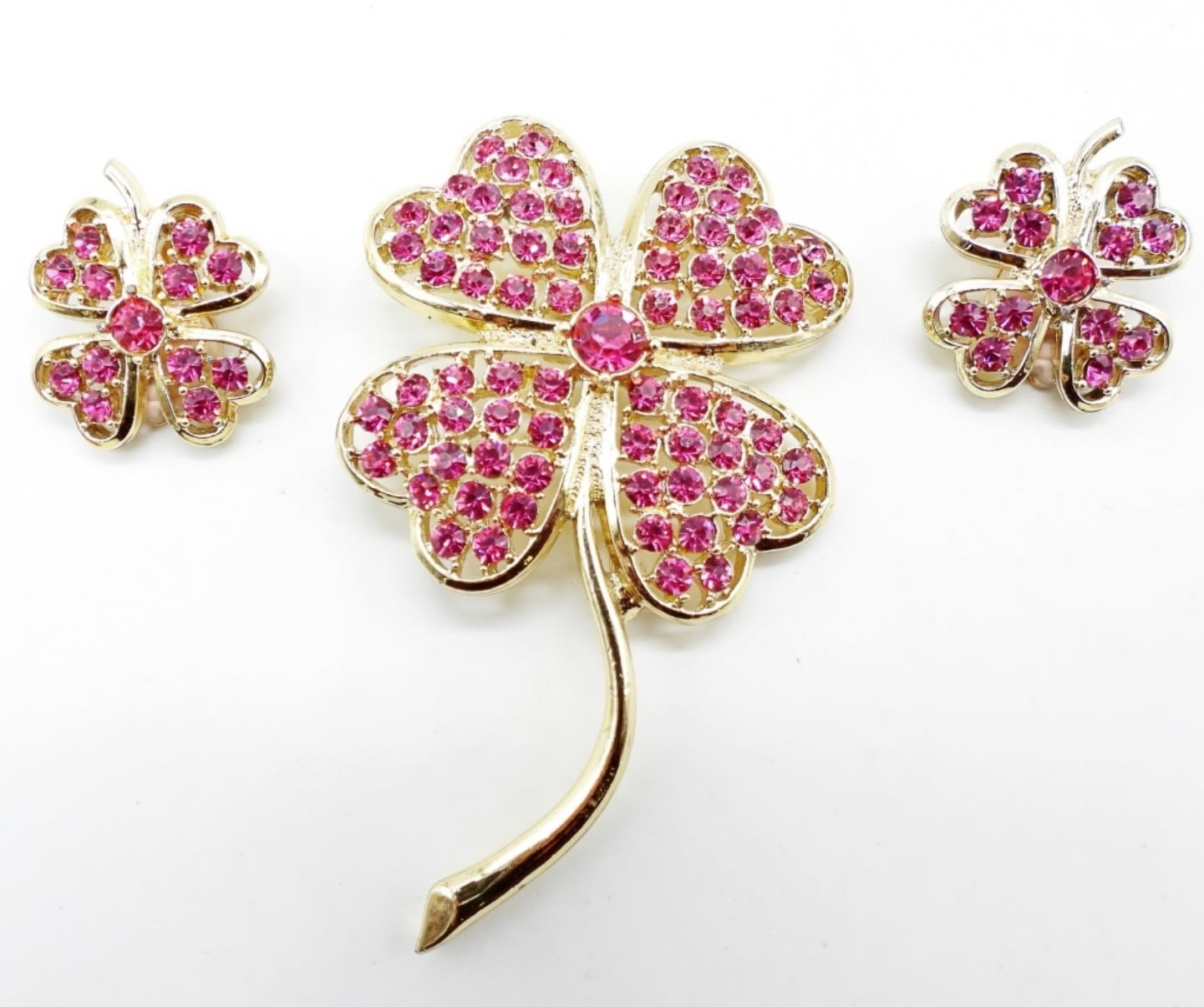 GOLD TONE WITH PINK RHINESTONES. 3″ BROOCH AND CLIP ON EARRINGS. ALL SIGNED ON BACK.