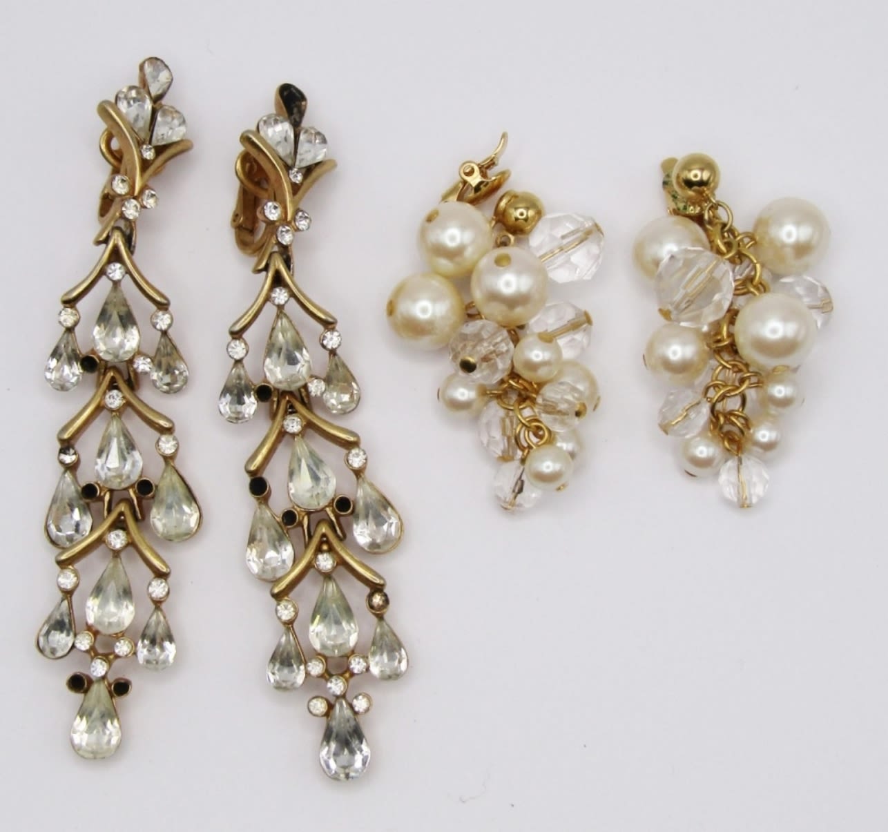 GOLD TONE CLIP-ON EARRINGS BOTH SIGNED ON BACK 2″ BEADS & 3.5″ TEAR DROP GEMSTONE (MISSING 1 LARGE STONE & 10 SMALL STONES)