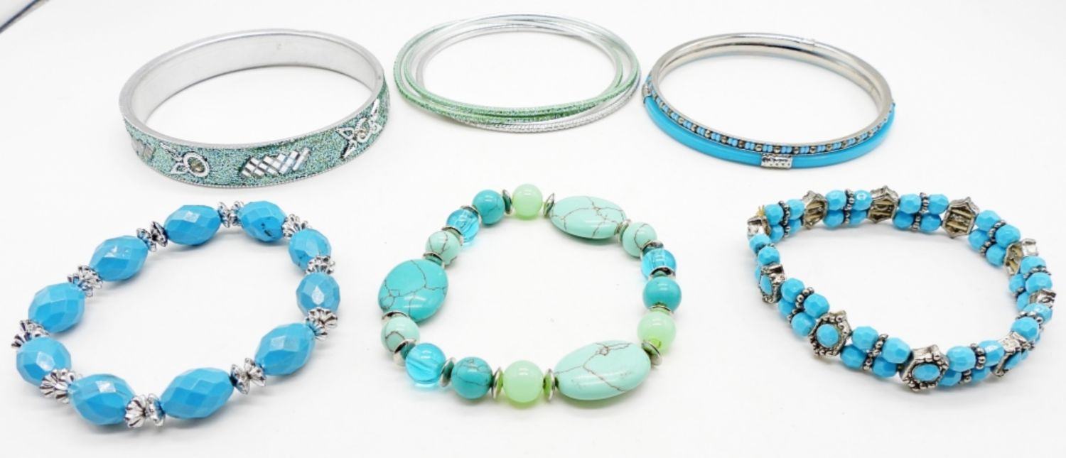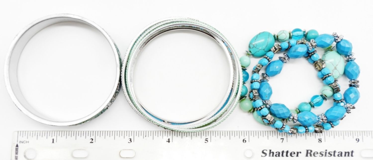ALL DIFFERENT APPROX 2.5″ DIAMETER. (6) BANGLES & (3) STRETCHY BEADED. CUTE MIX AND MATCH SET!