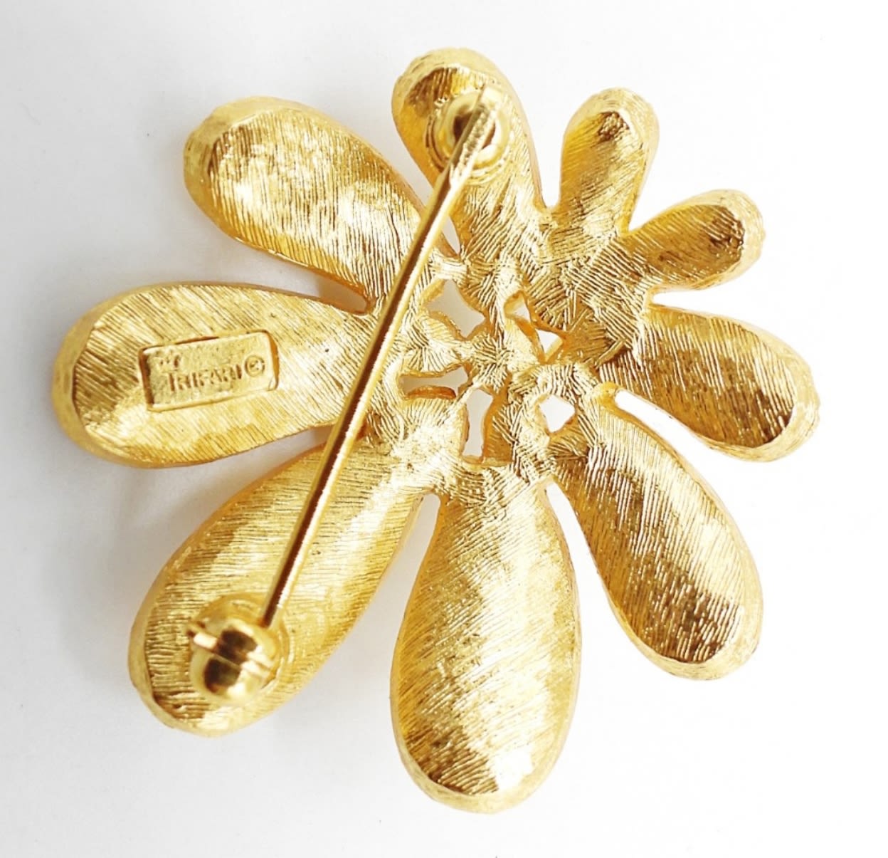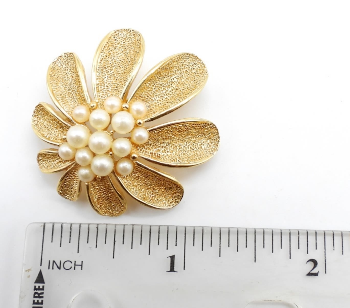 GOLD TONE WITH FAUX PEARL CENTER. 1″ LONG. SIGNED ON BACK