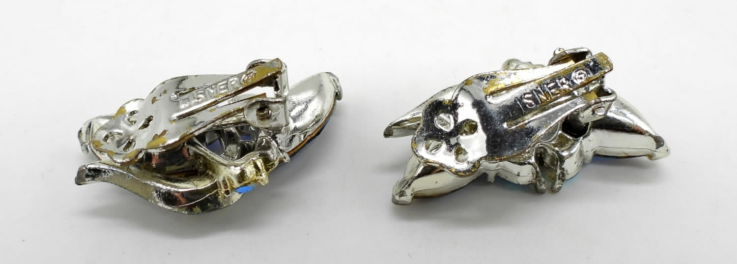 BEAUTIFUL TEXTURED SILVER TONE EARRINGS WITH BLUE GEMS (3 SMALL GEMS MISSING). SIGNED ON BACK