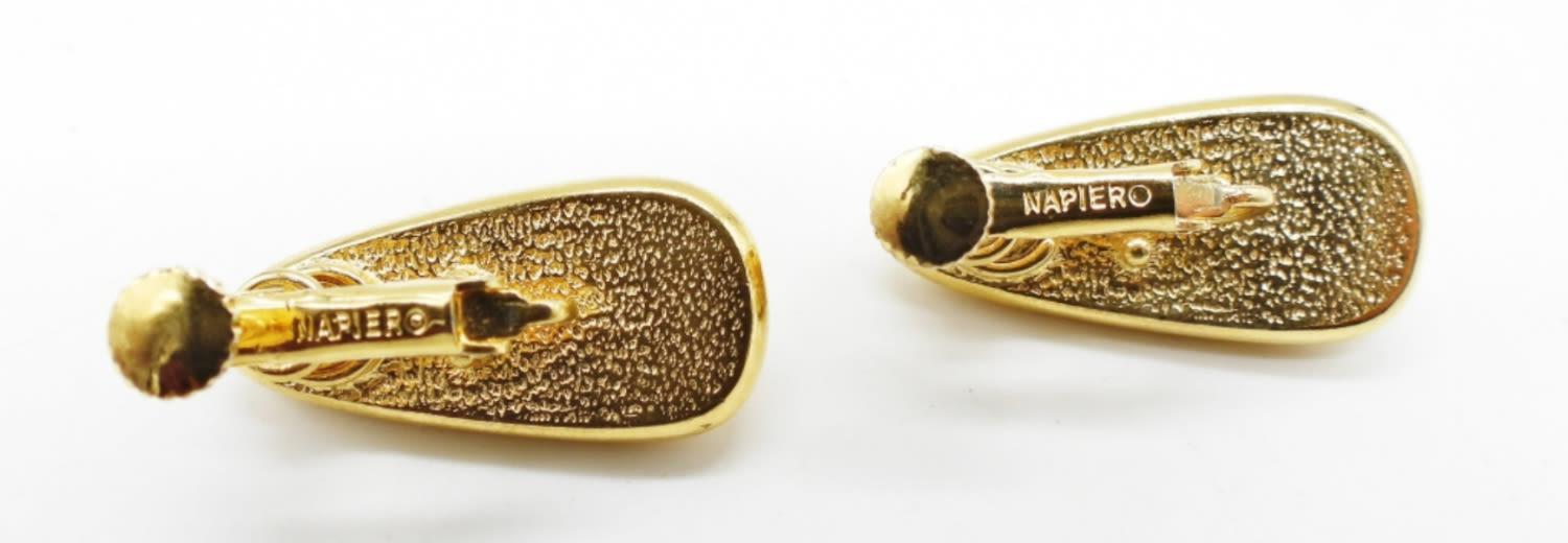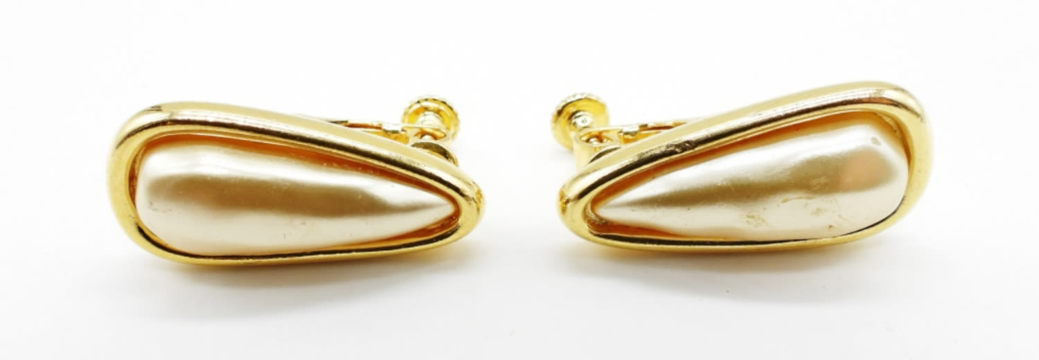 GOLD TONE FAUX PEARL DROPS. CLIP ON WITH SCREW BACK FOR SIZING. SIGNED ON BACKS.