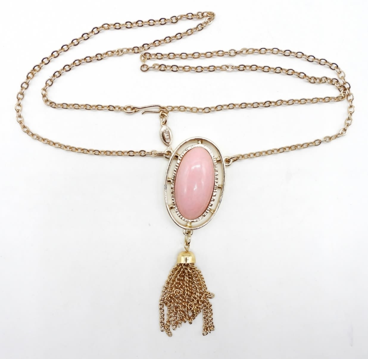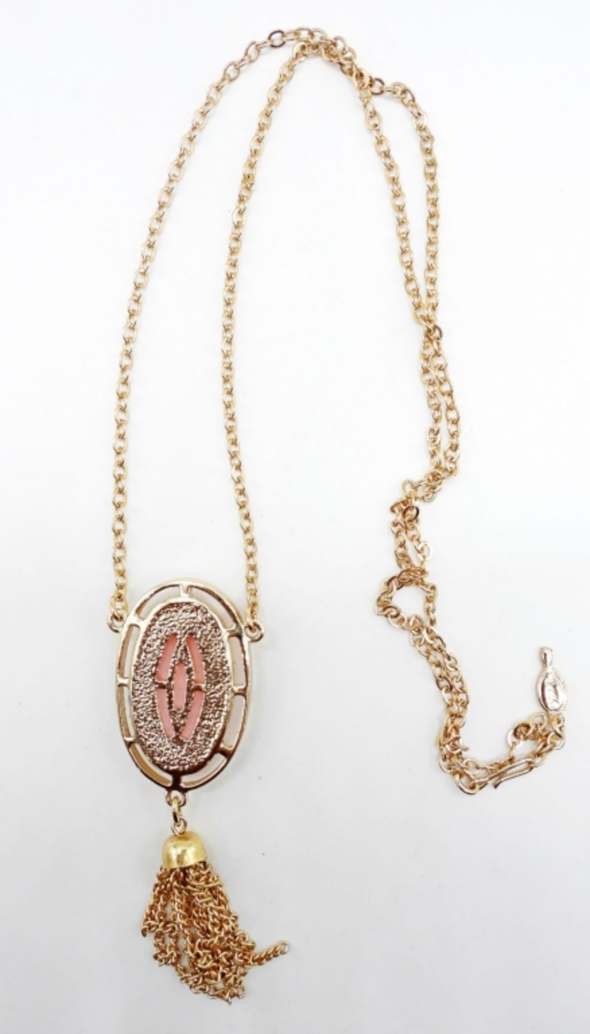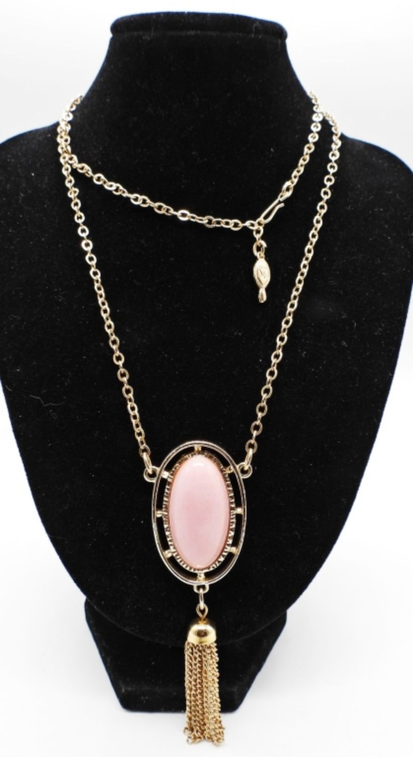 26″ NECKLACE WITH PINK STONE & TASSLE. SIGNED ON HANG TAG