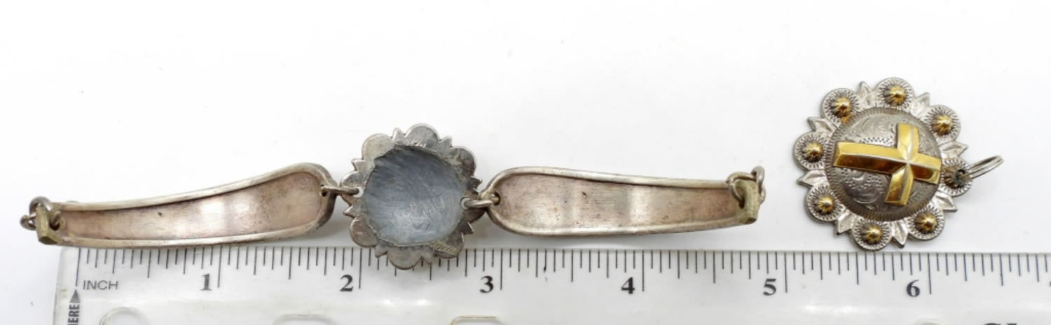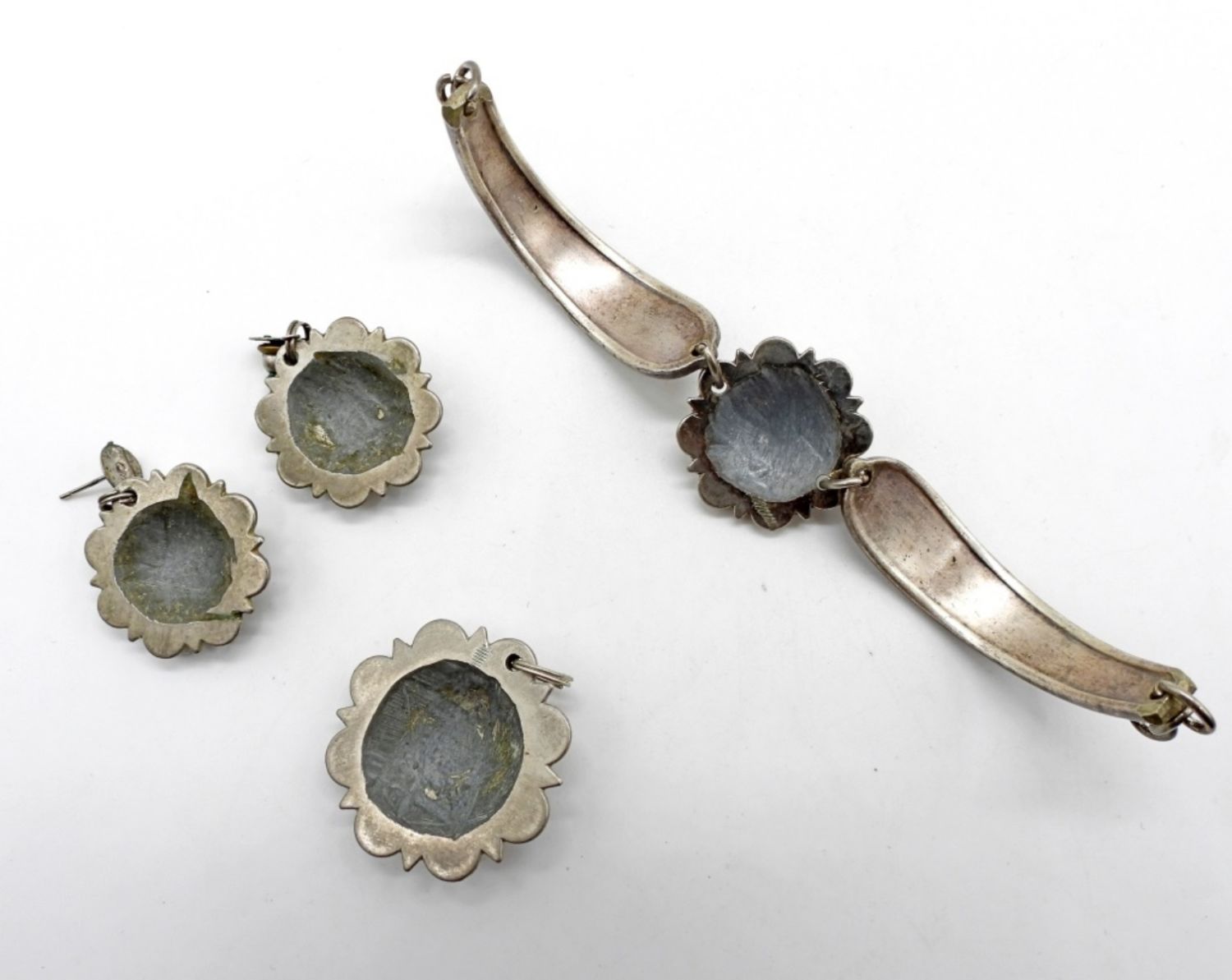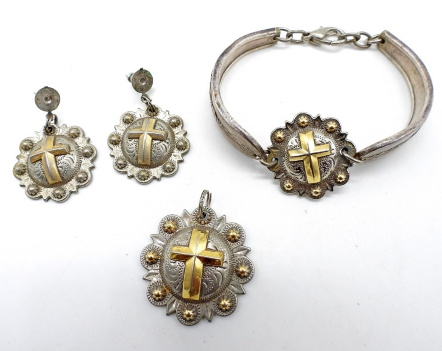 DUAL TONE 2″ DIAMETER BRACELET W/ MATCHING PENDANT & PIERCED DANGLE EARRINGS. ONE MISSING BACKING.