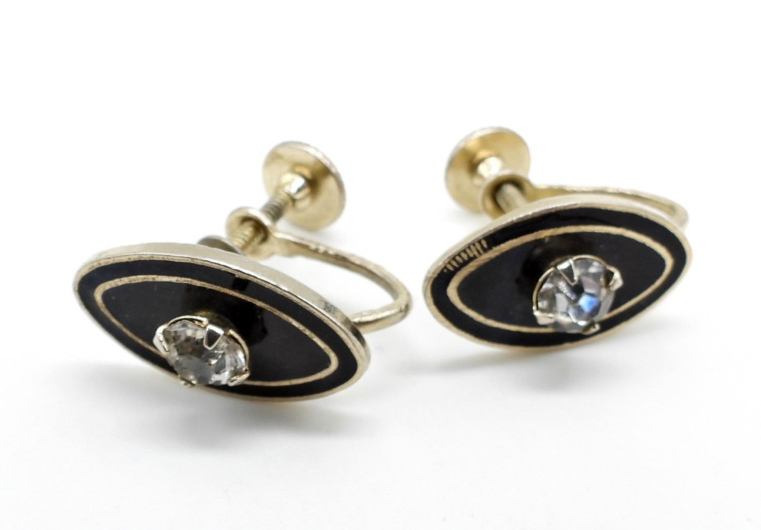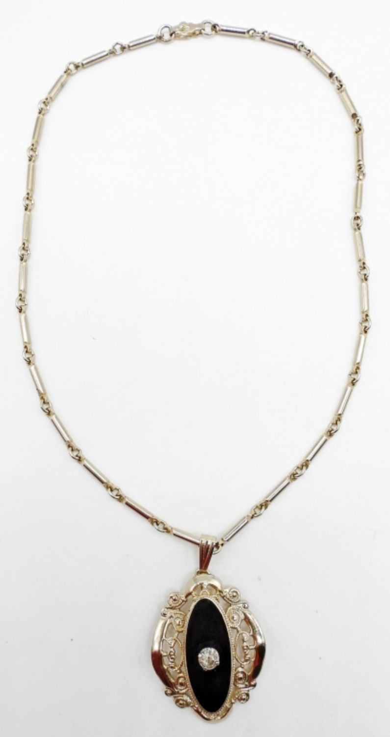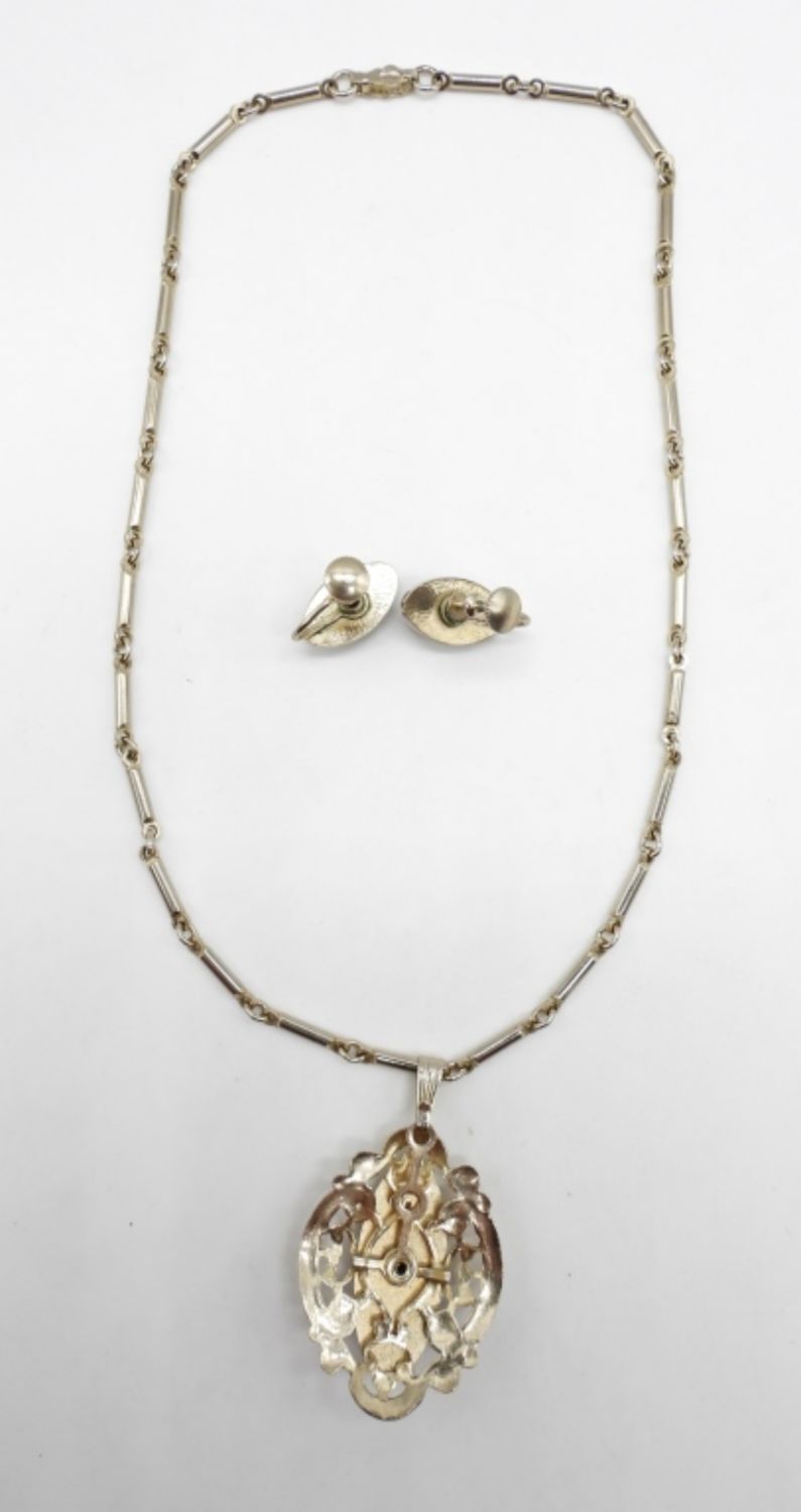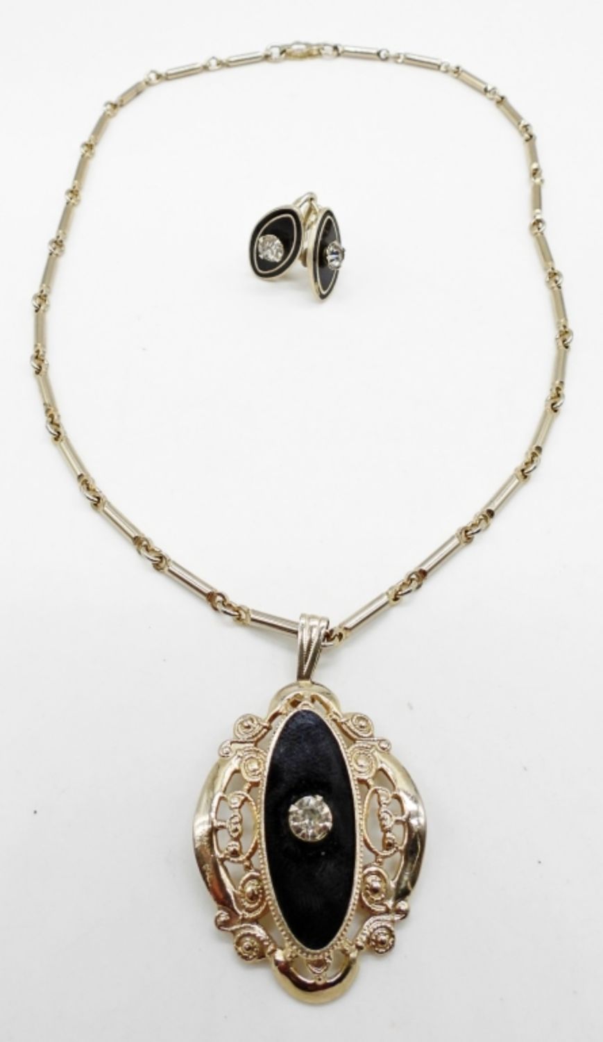 BLACK ENAMEL WITH CLEAR GEM 14″ NECKLACE w/ FILIGREE & SCREW BACK EARRINGS.