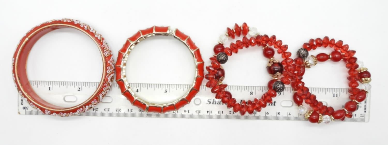 (1) 2.5″ BANGLE, (1) 2.25″ HINGED BANGLE, & (4) STRETCHY 2″ BRACELETS. WITH BEAD AND ENAMEL ACCENTS.