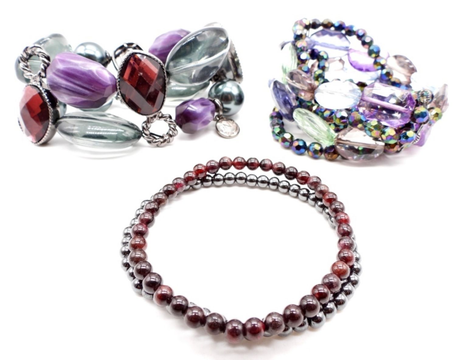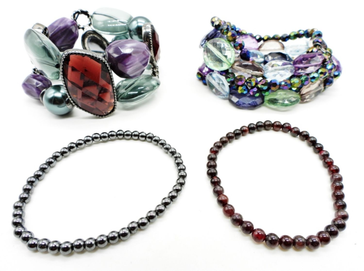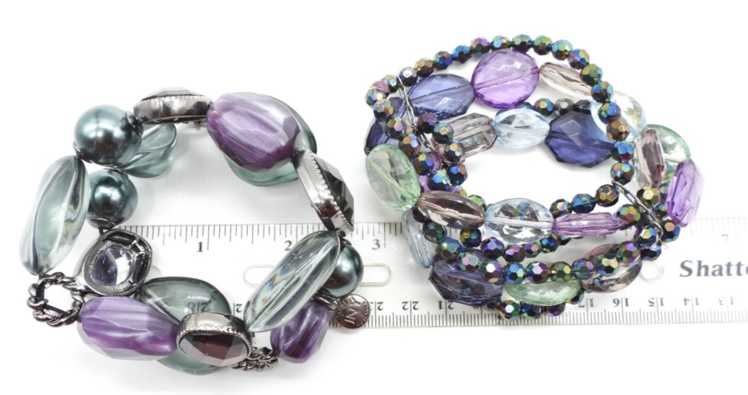 ALL DIFFERENT APPROX 2″ DIAMETER WITH BEADS IN COOL TONES. DEEP PURPLE, GREEN AND BLUE.