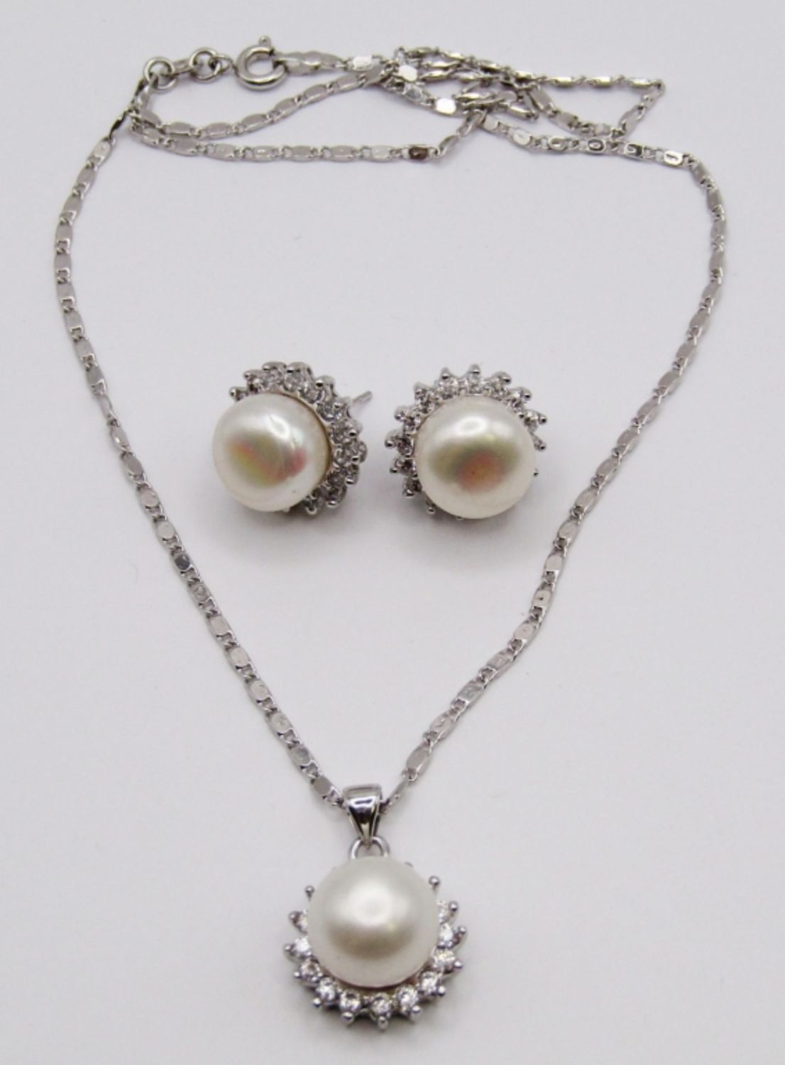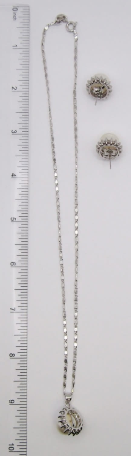 LARGE FAUX PEARLS ENCIRCLED BY CLEAR GEMSTONES. 18″ NECKLACE & PIERCED STUD EARRINGS. NECKLACE CLASP AND BAIL STAMPED 18K GP