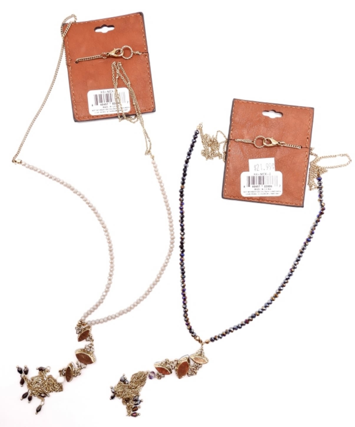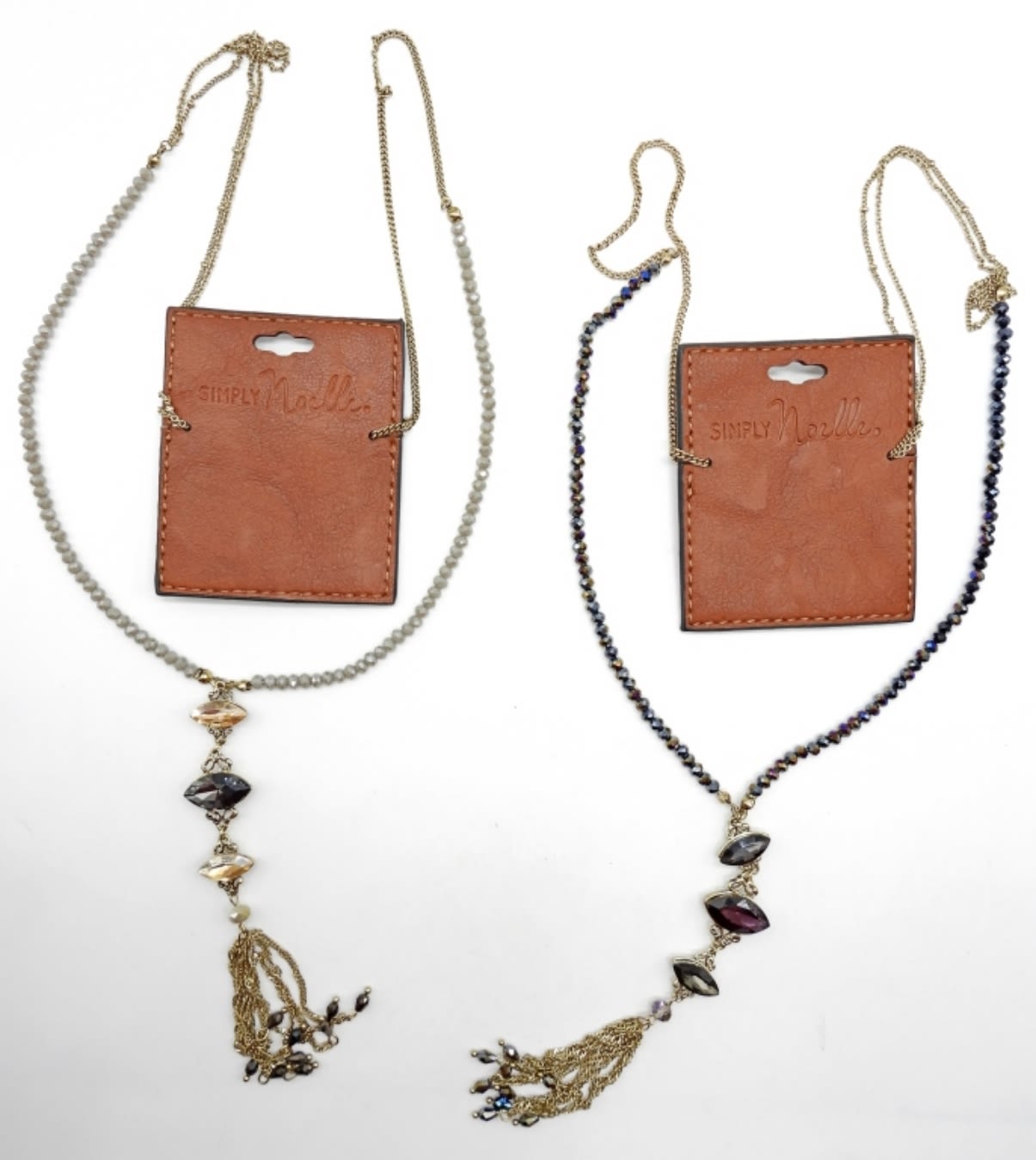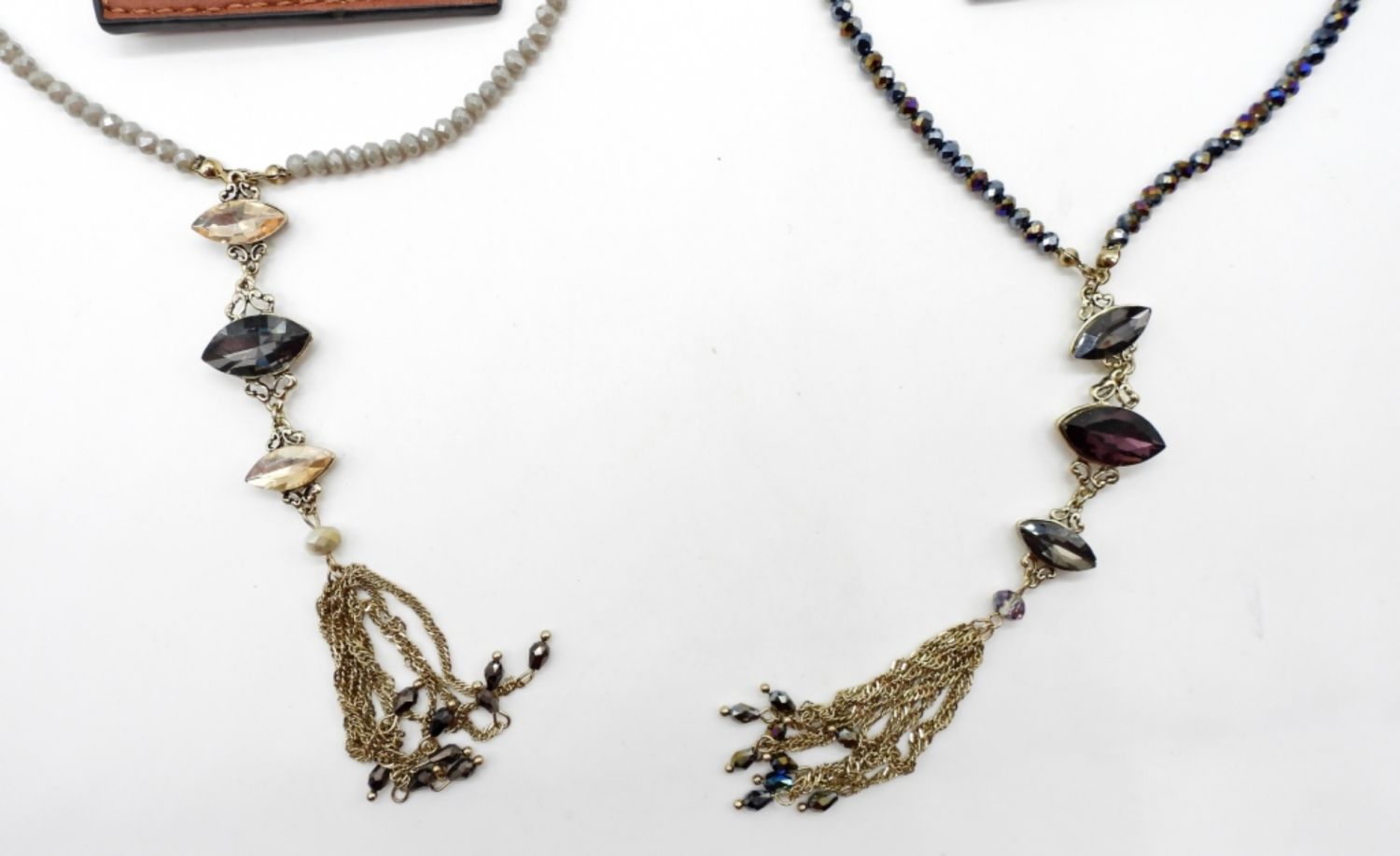 GOLD TONE WITH TASSEL, BEADS & GEMS. (1) GREY, (1) BLACK. ON ORIGINAL RETAIL HANGERS.