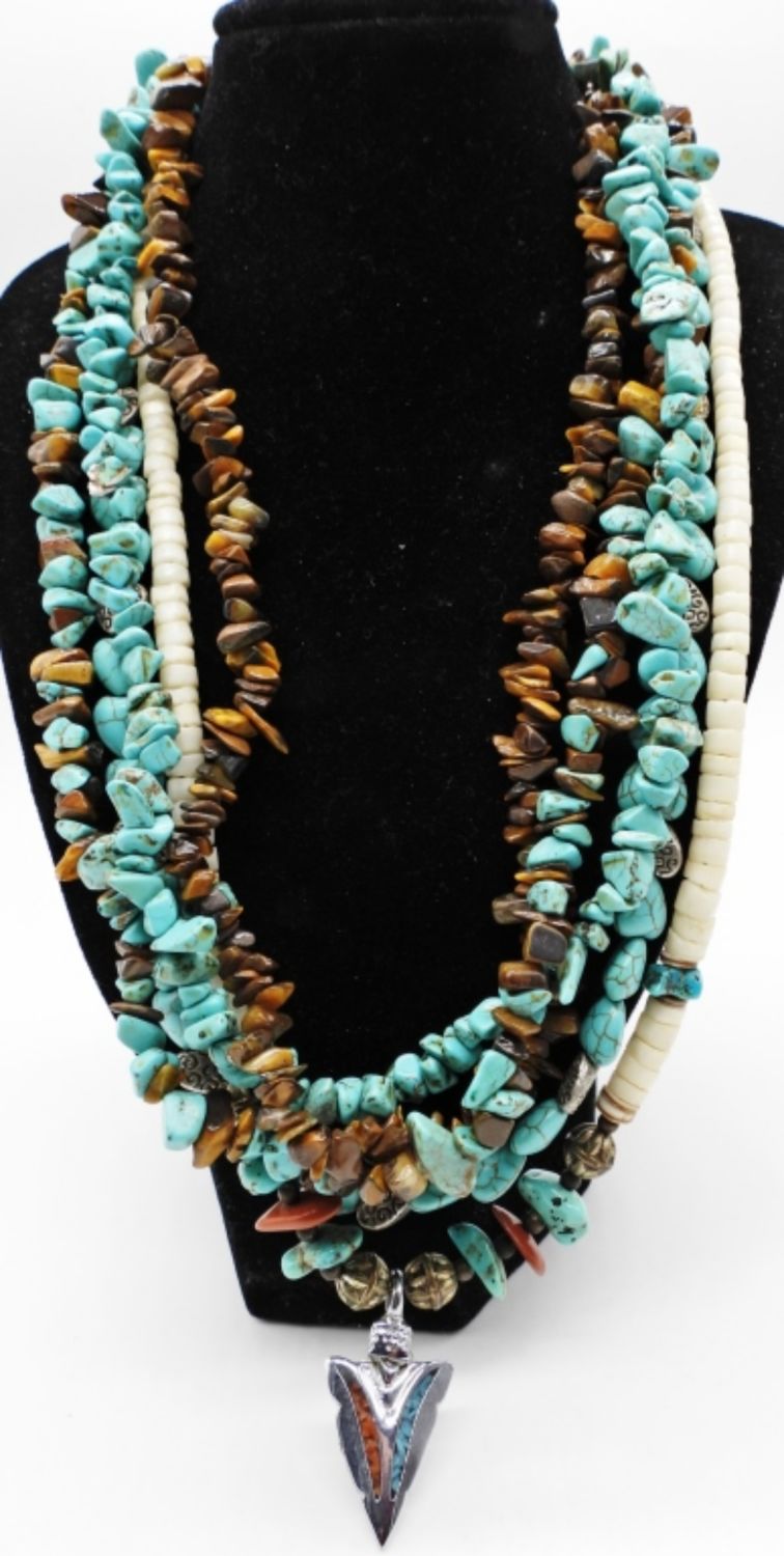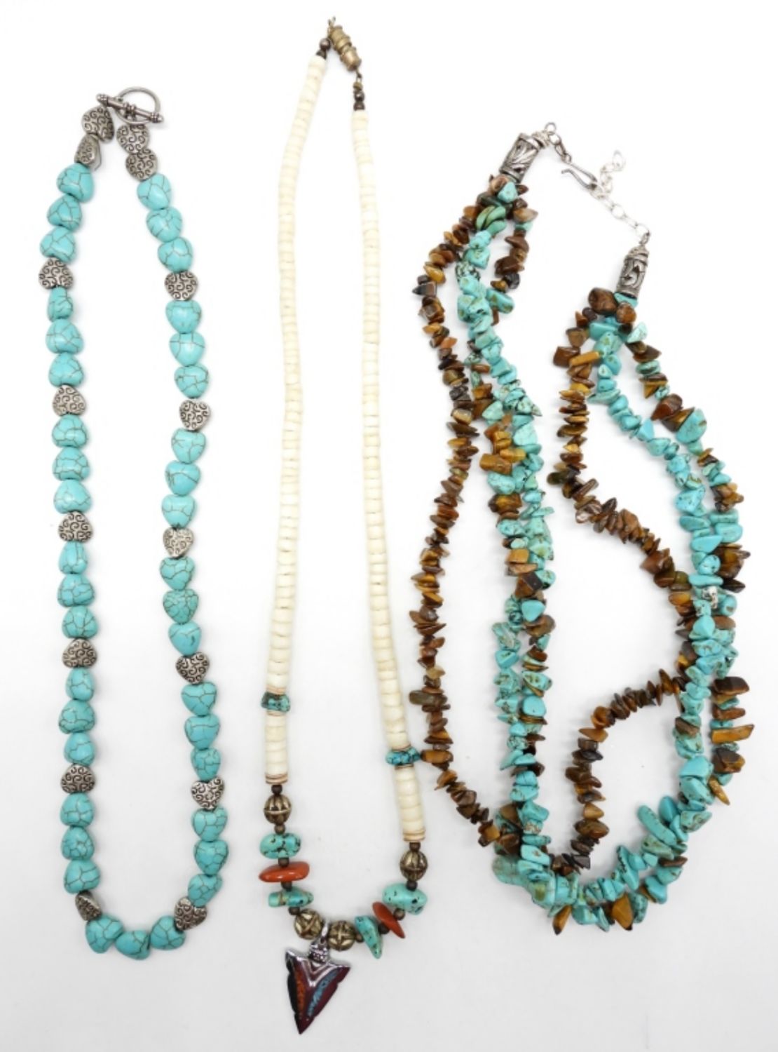 (1) 19″ ARROWHEAD CHARM W/ BEADS, STONES & SHELLS, (1) 17″ MULTI LAYER CHIPPED STONE, & (1) 18″ TURQUOISE COLOR & SILVER TONE HEART BEADS.