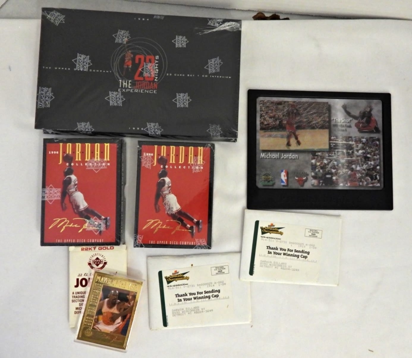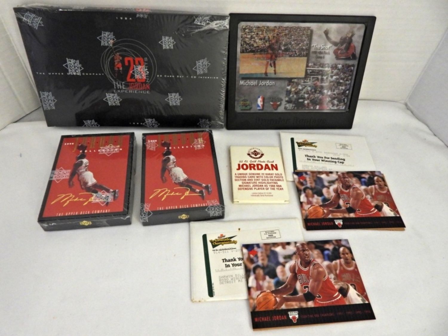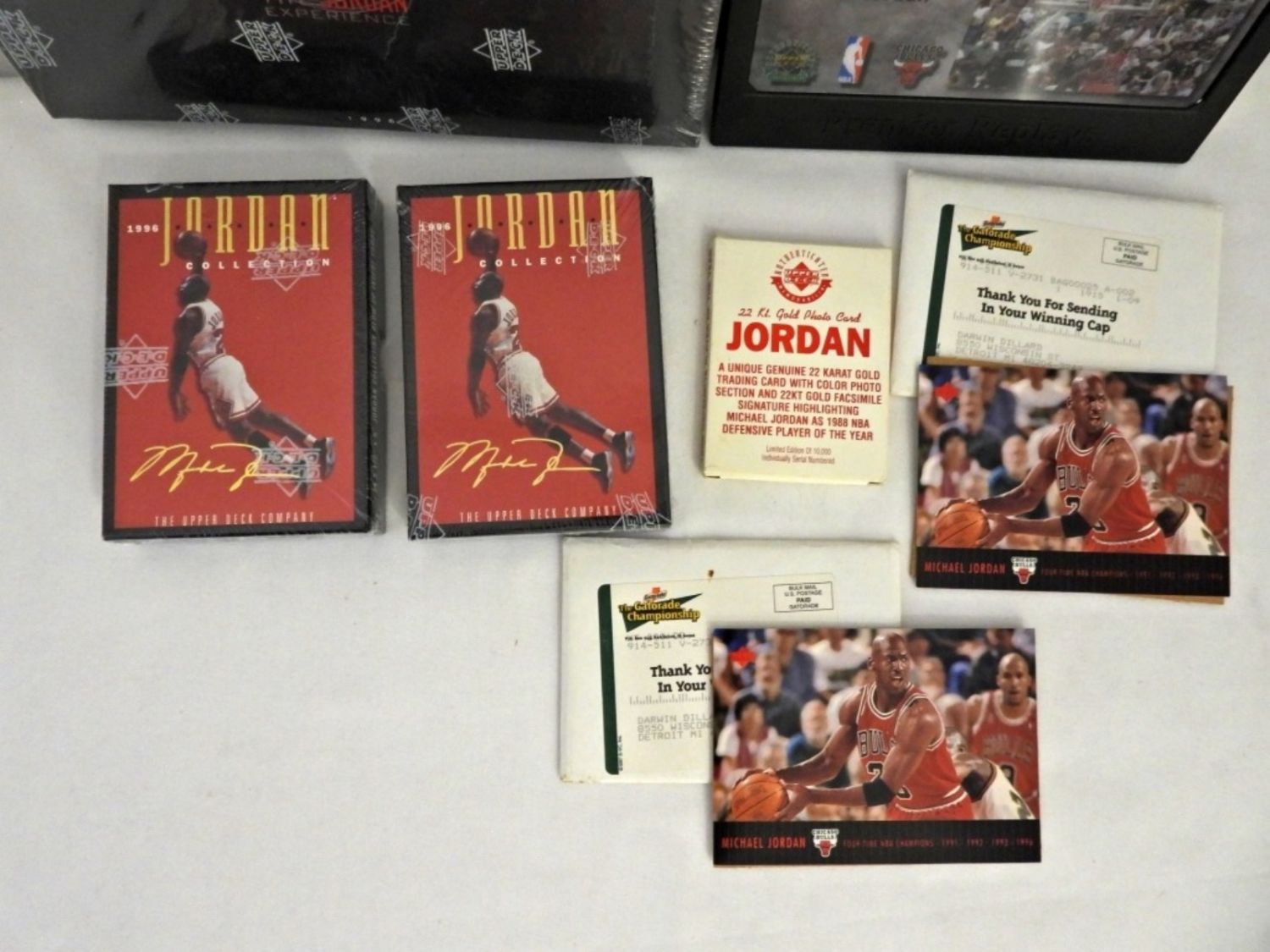 1996 Upper Deck 23 Nights The Michael Jordan Experience Factory Sealed Box Set, (2) 1996 UPPER DECK BLOW-UP INSERT SETS sealed, 22 kt GOLD CARD, (2) GATORAD CHAP INSERT JORDAN CARDS & PREMIER REPLAYS UPPER DECK “THE SHOT”
