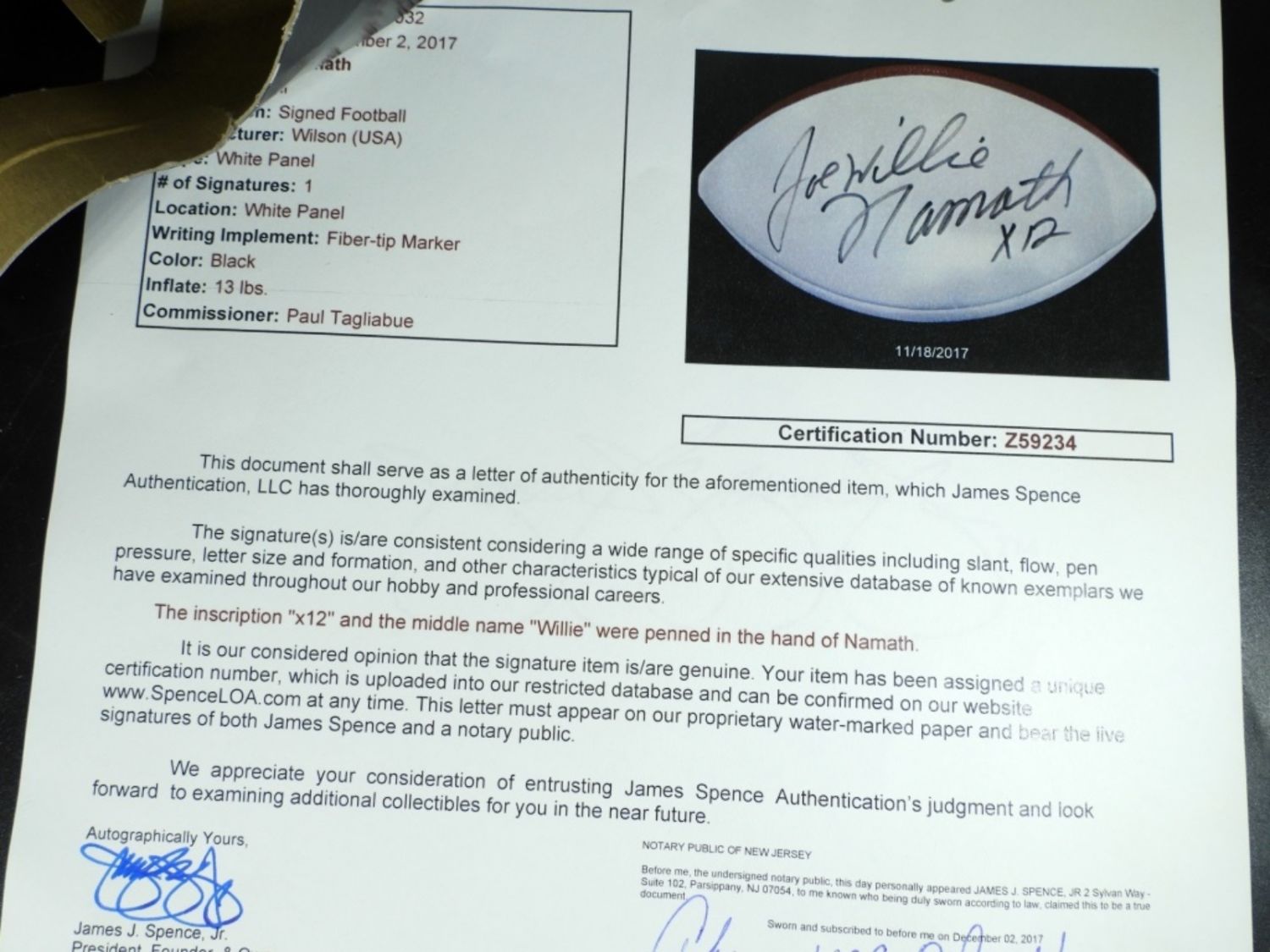 WILSON FOOTBALL – AUTHENTIC JSA CERT #Z59234