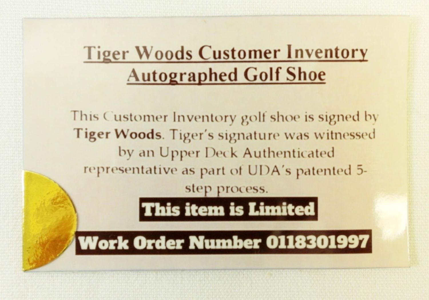 INCLUDES CARD STATING “CUSTOMER INVENTORY GOLF SHOE is SIGNED by TIEGER WOODS. TIGER’S SIGNATURE WAS WITNESSED by an UPPER DECK AUTHENTICATED REPRESENTATIVE” in ORIGINAL SHOE BOX / PAIR – NOT an Upper Deck COA